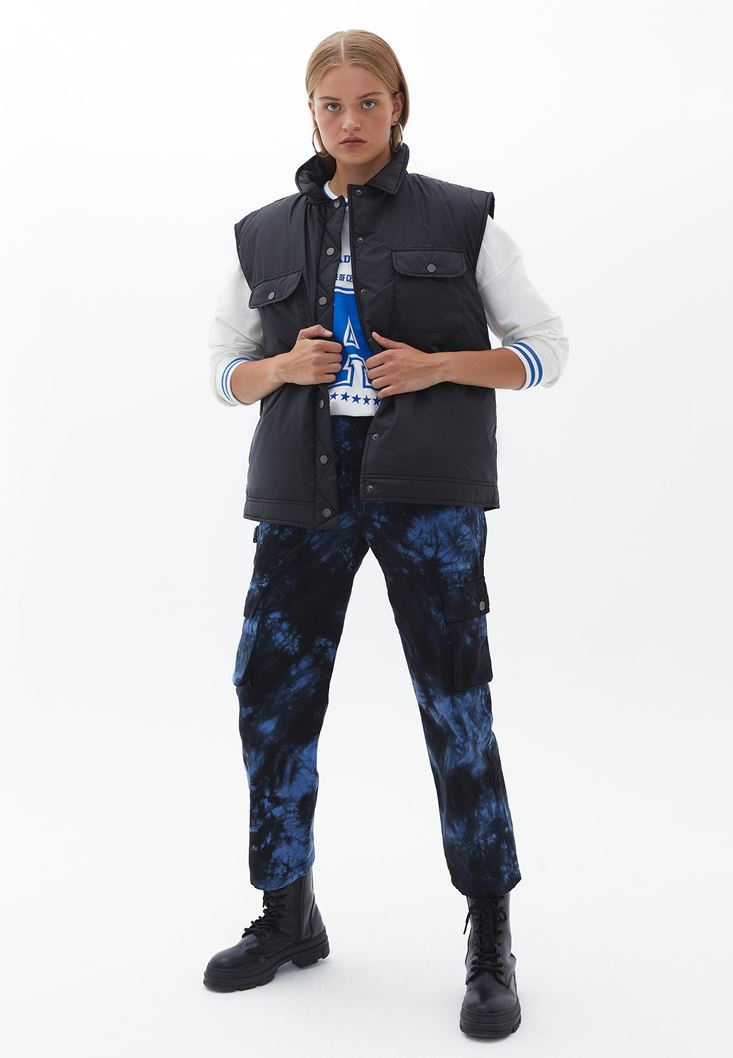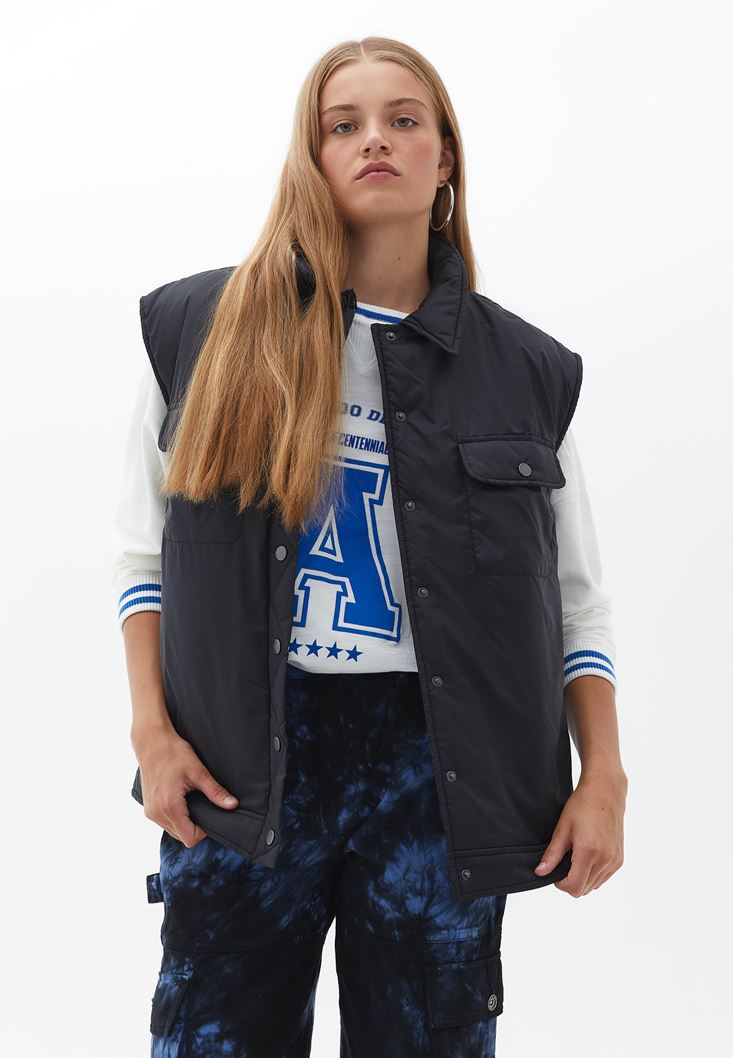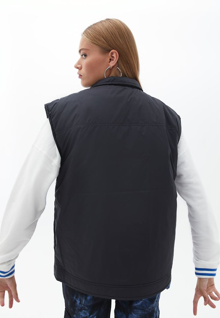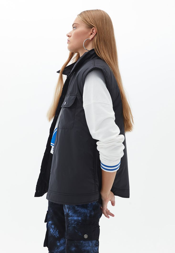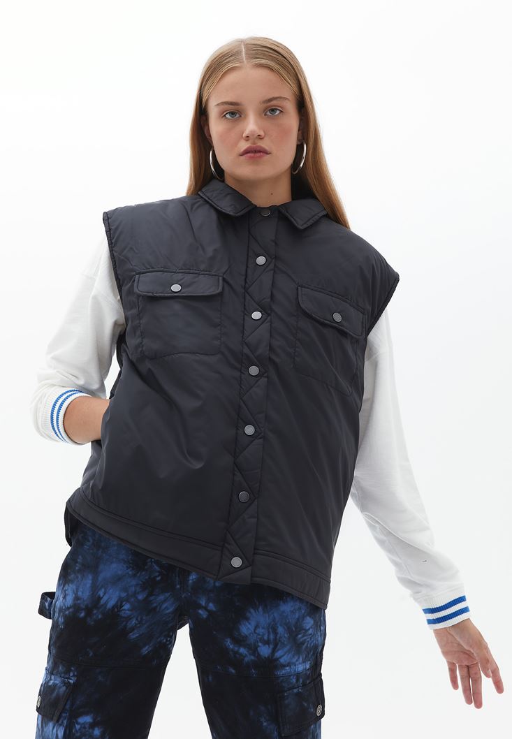 Dolgulu puf doku, üst kısmında iki kapaklı cep, çıtçıt kapamalı,  oversize-fit, standart boy, alt kısmı iki cepli.