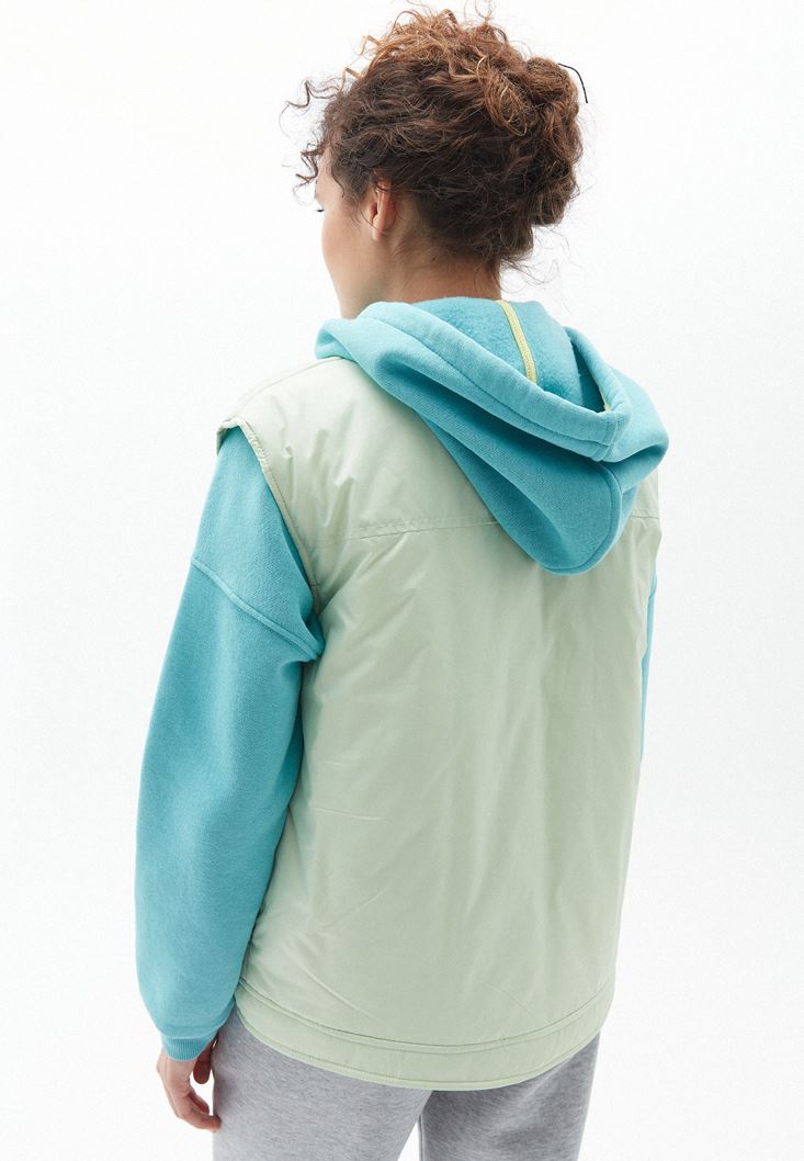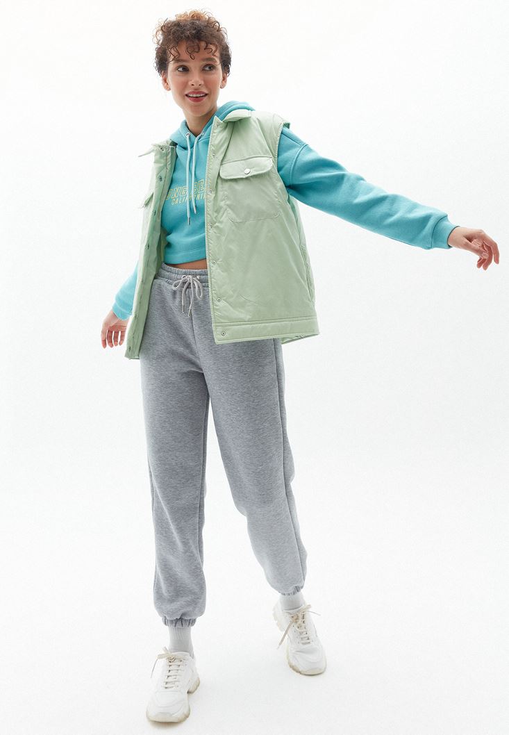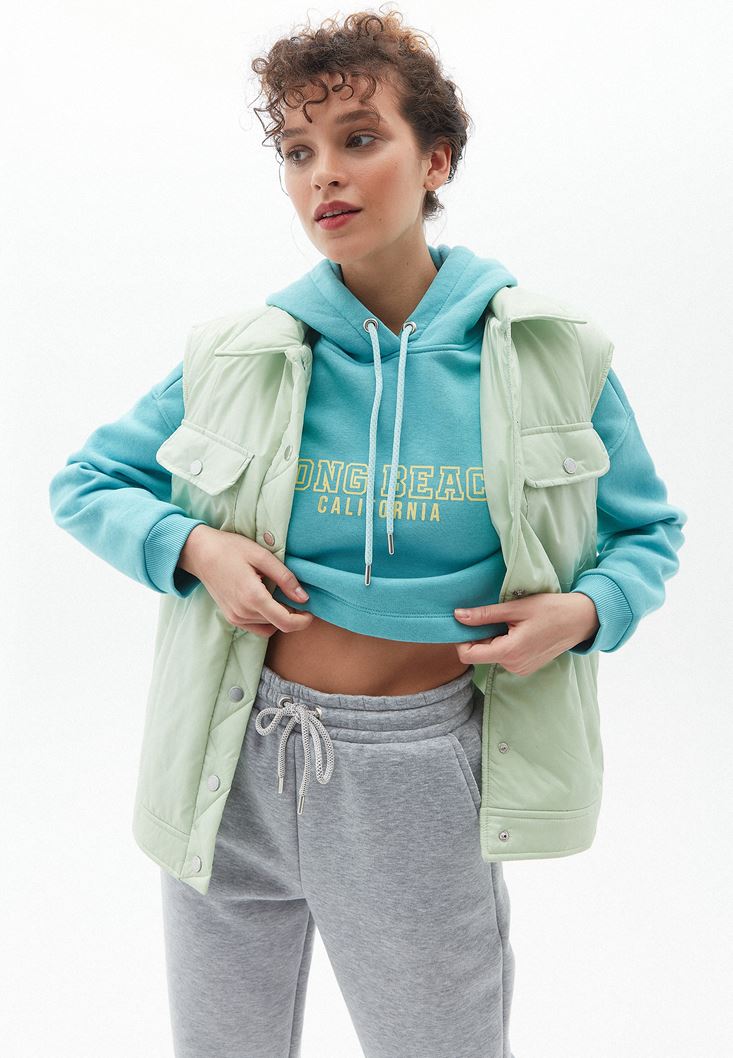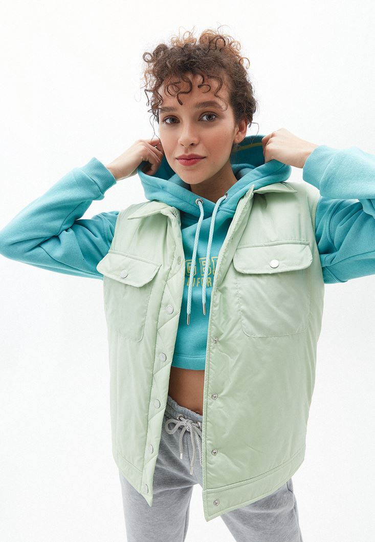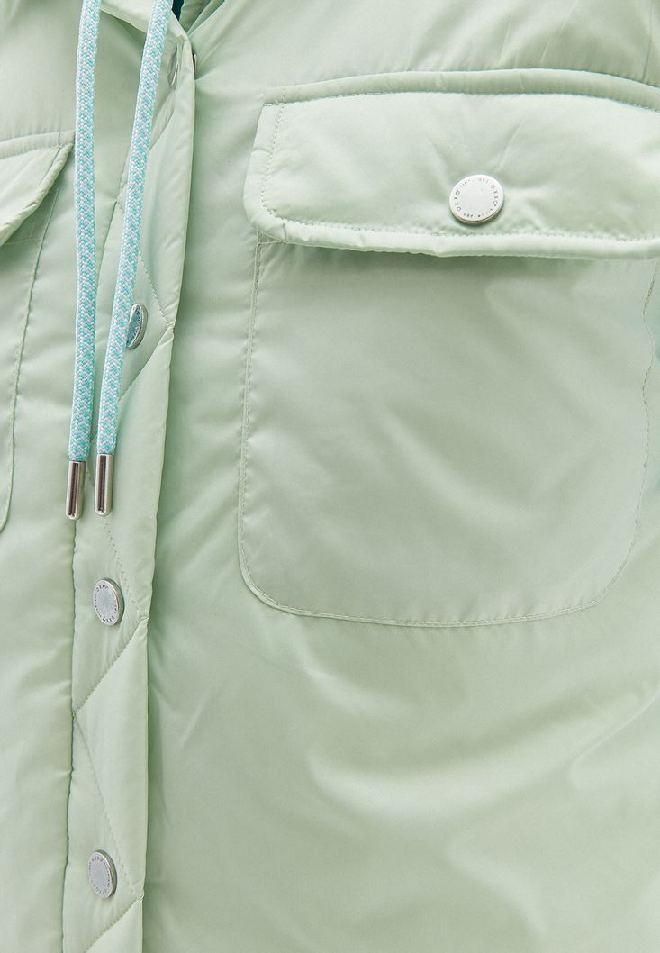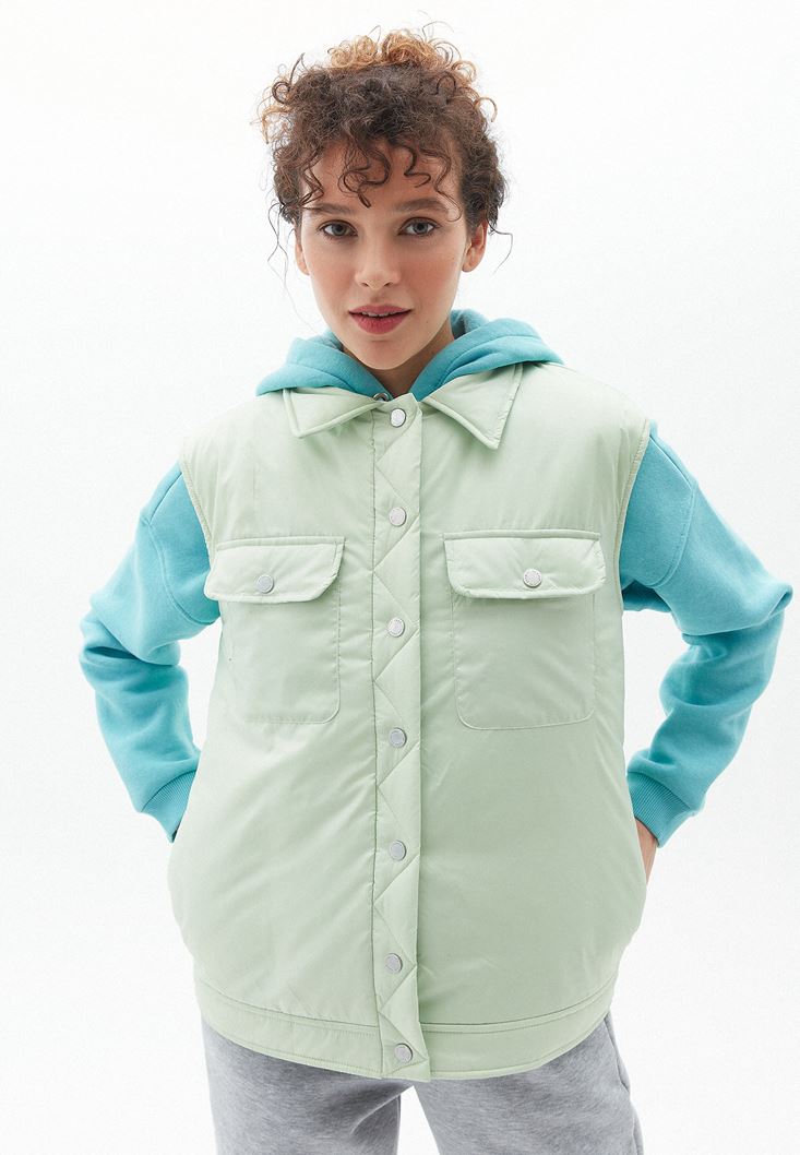Dolgulu puf doku, üst kısmında iki kapaklı cep, çıtçıt kapamalı,  oversize-fit, standart boy, alt kısmı iki cepli.