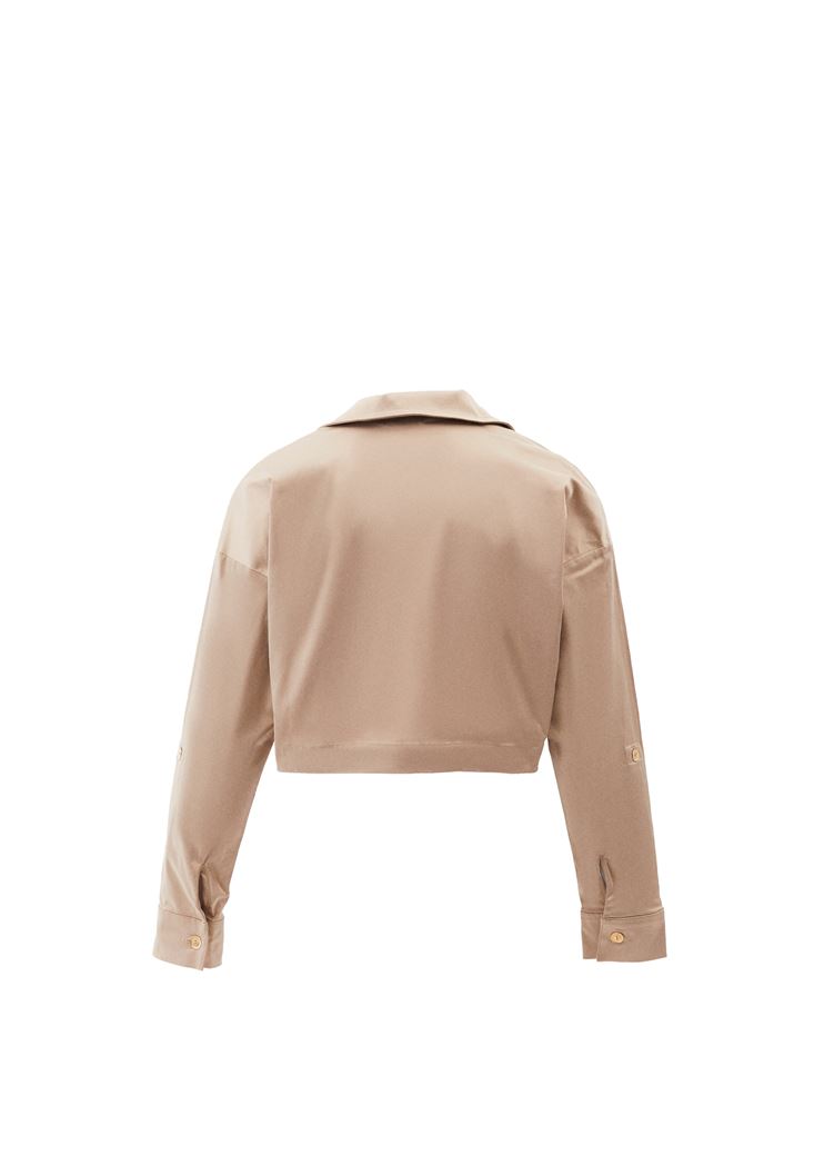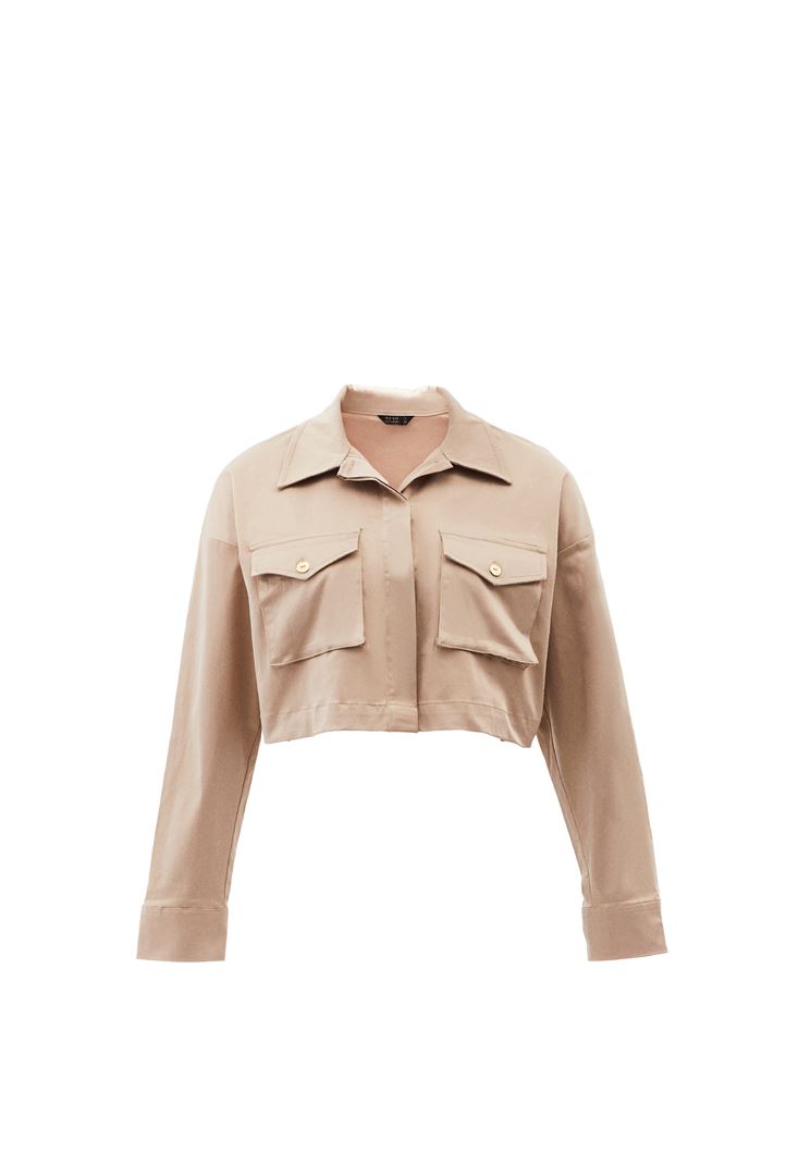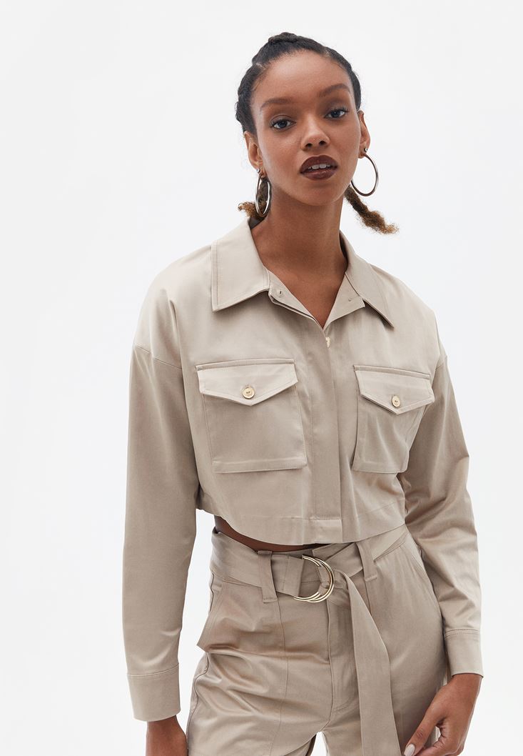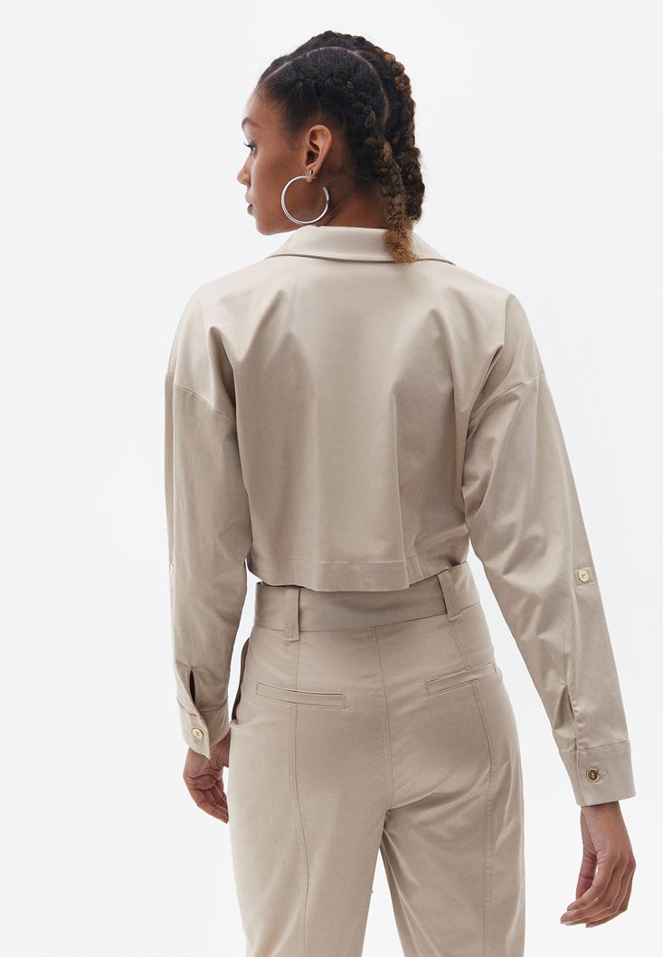 Pamuk karışımlı doku, bedenden uzak oversize fit, uzun kollu, ön kısmı iki cepli, crop kesim, gizli düğme kapamalı.