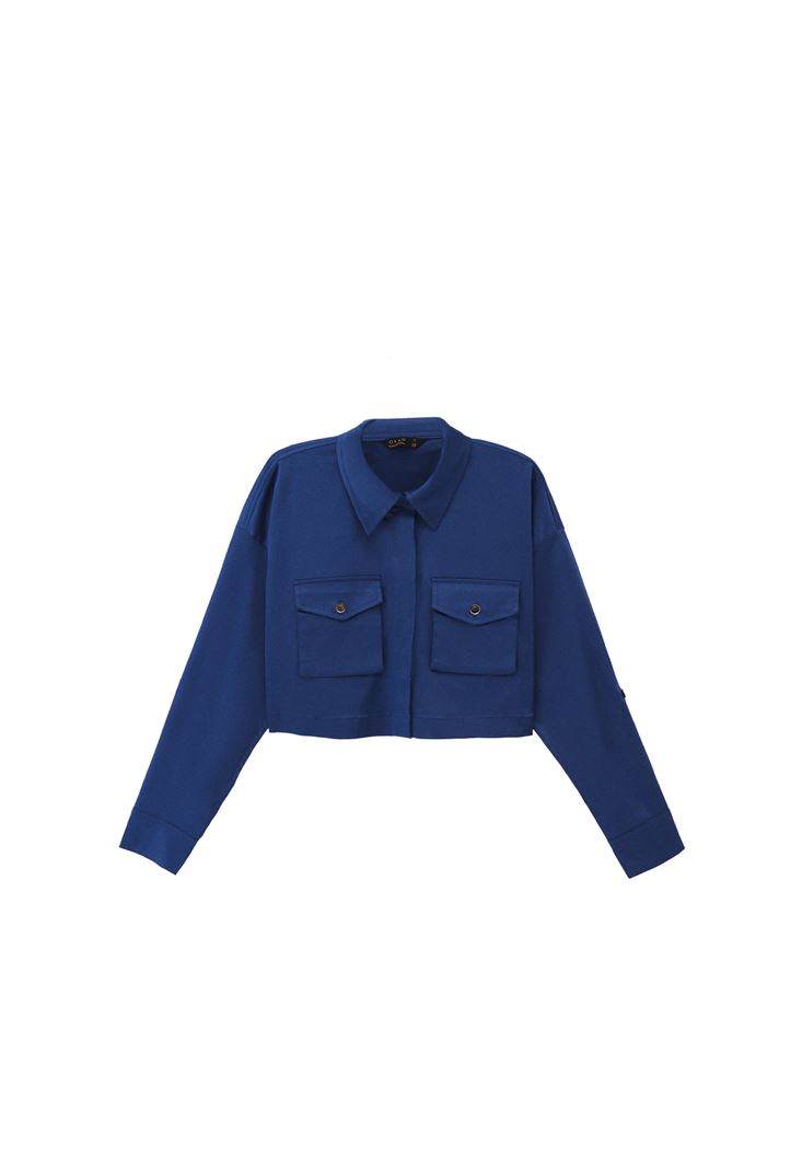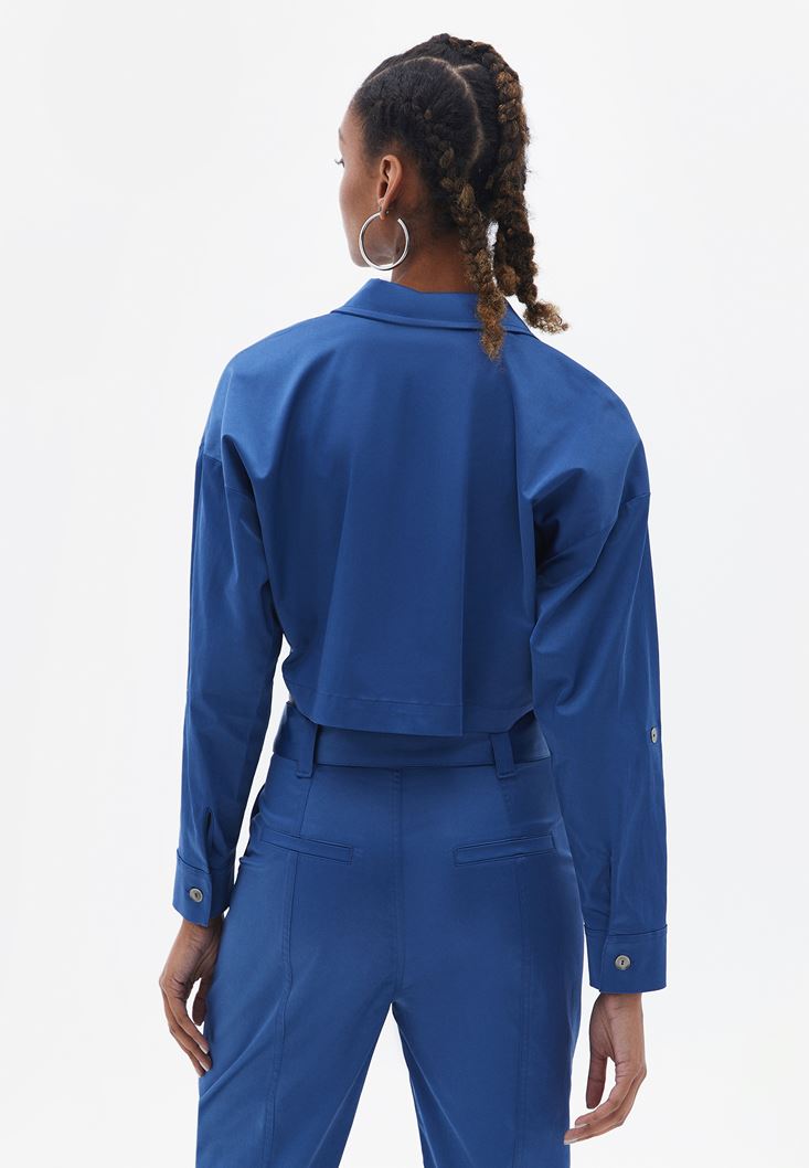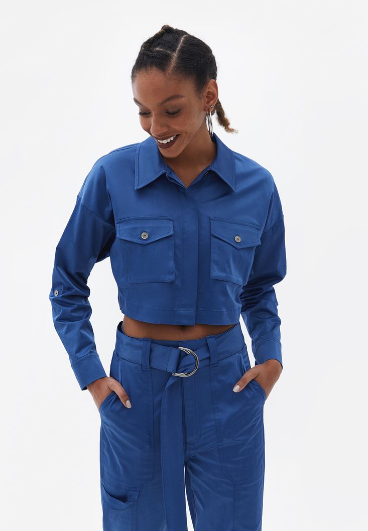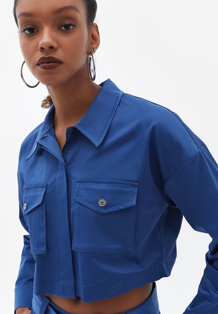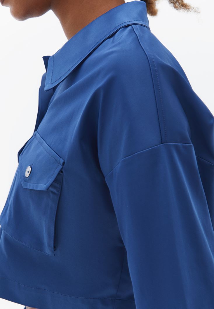 Mavi Cepli Crop Gömlek
