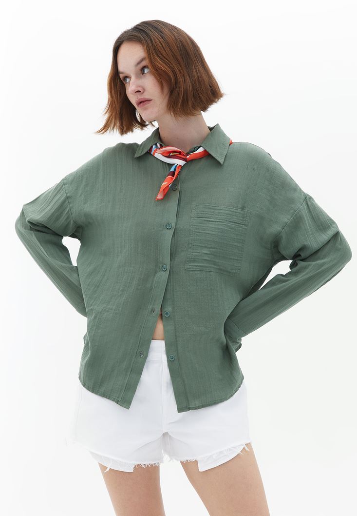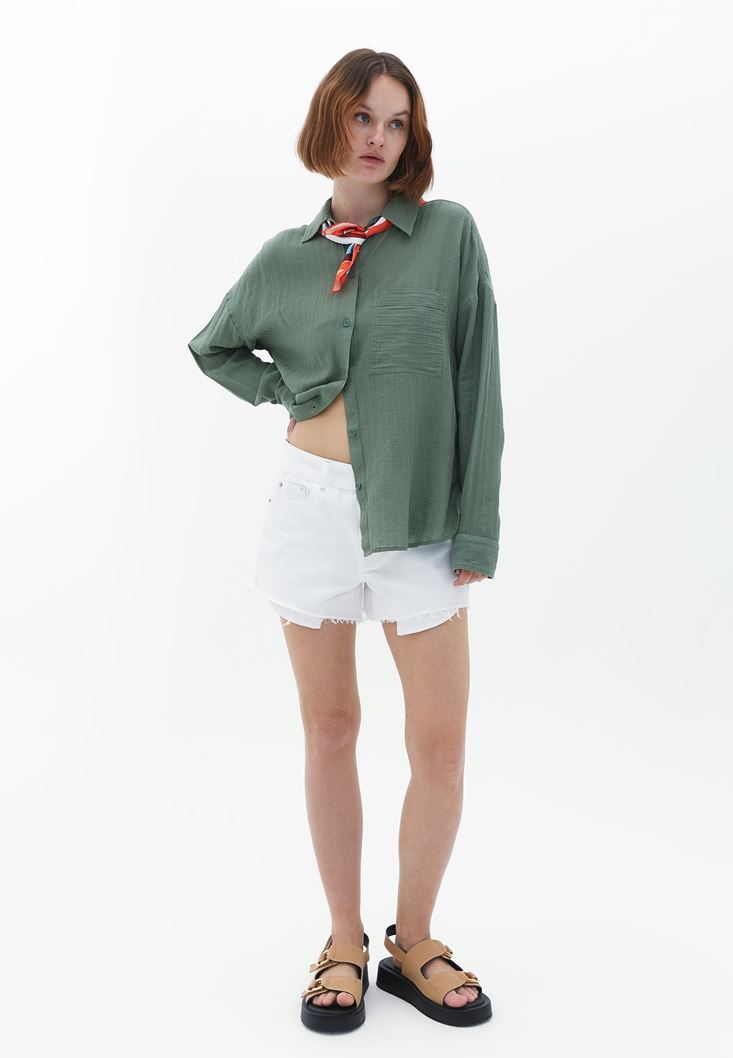 Cepli Gömlek ve Denim Mini Şort Kombini