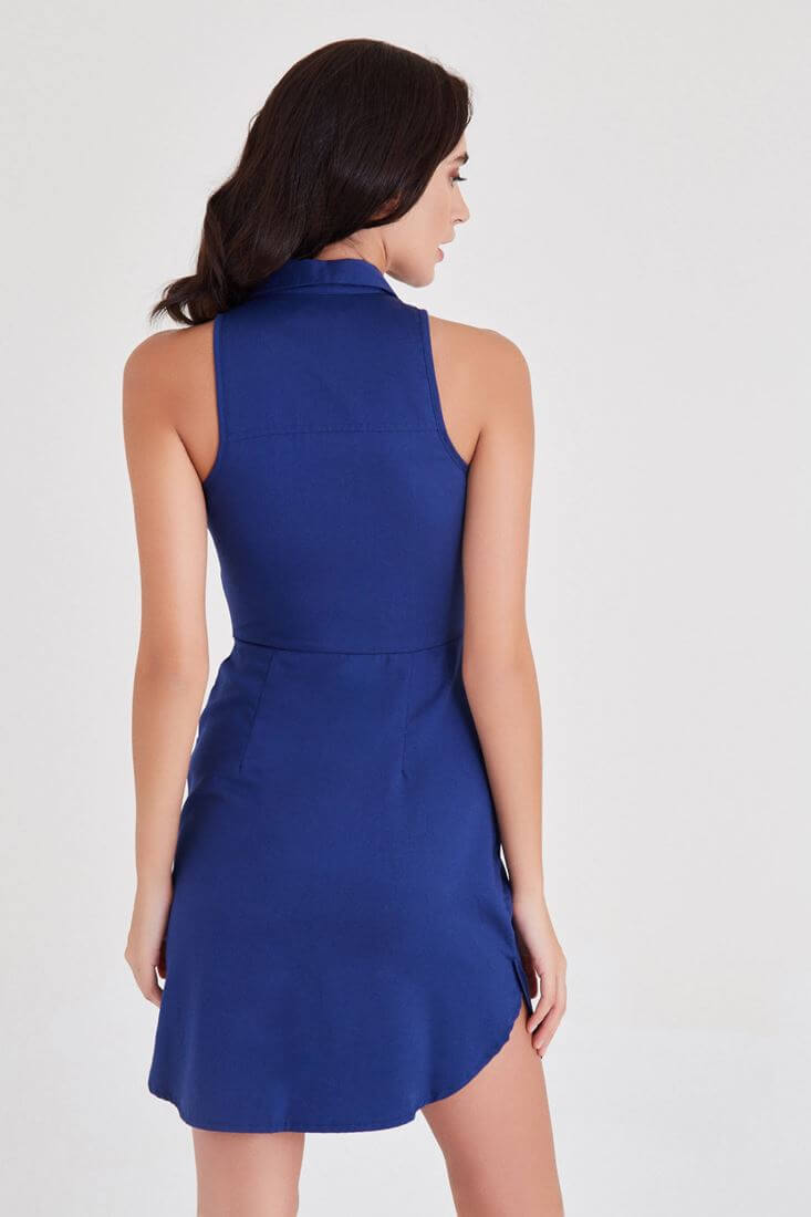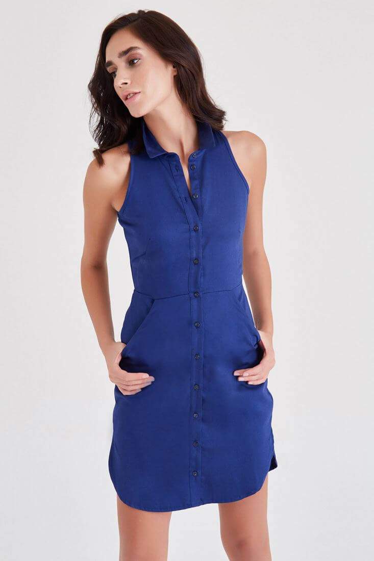 Gömlek elbise trendi, hem günlük stilimizi, hem de ofis stilimizi etkisi altina aldi. Gömlek kesimli, Cepki Kolsuz Dizüstü Elbise, sik görünümü, pamuklu kumasi ve mavi ve turuncu renkleriyle göz alici bir sikliga davetiye çikariyor.