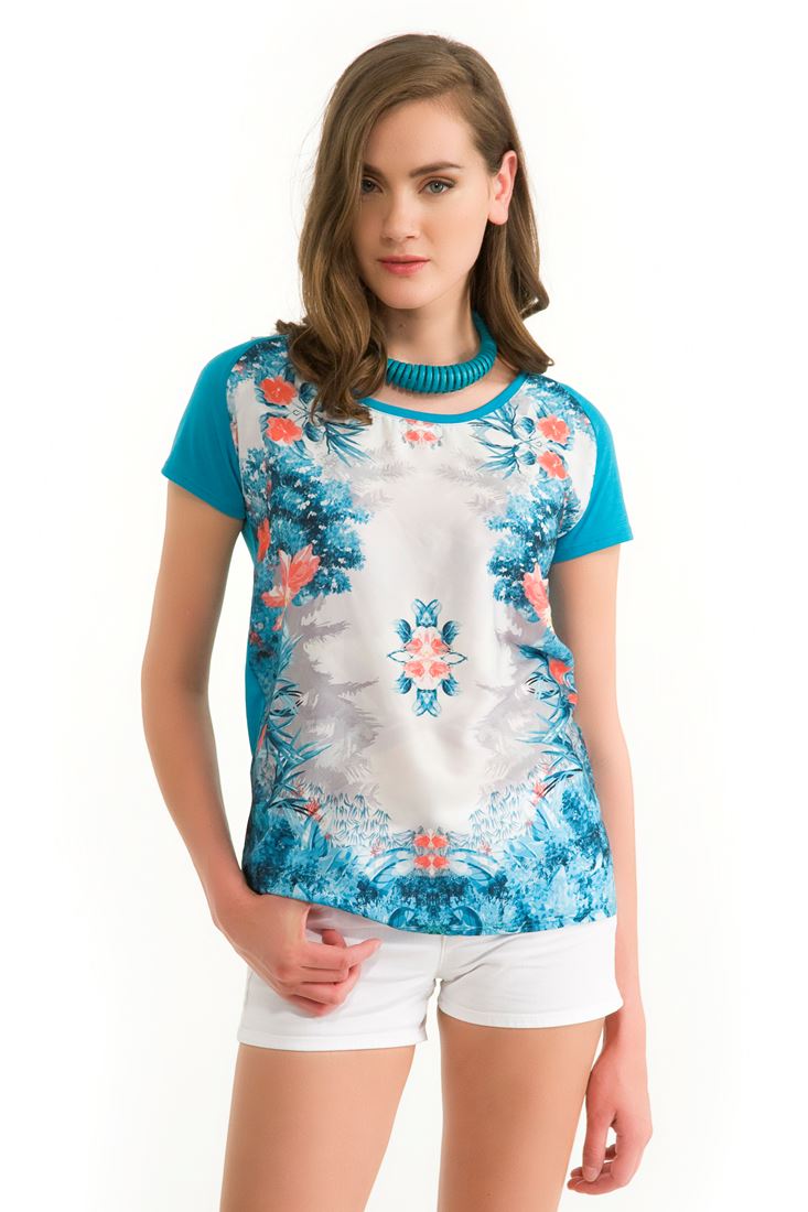 Mavi Çiçek Baskılı Tişört