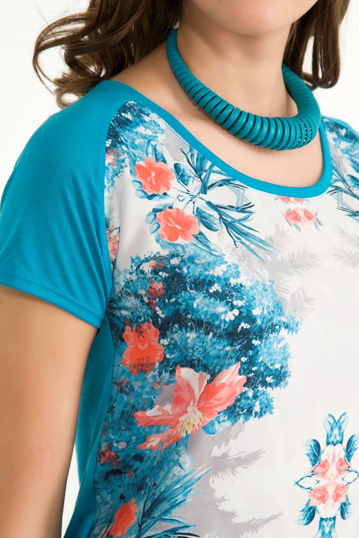 • Bayan Mavi Çiçek Baskılı Tişört