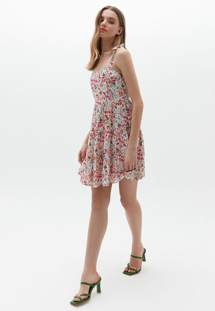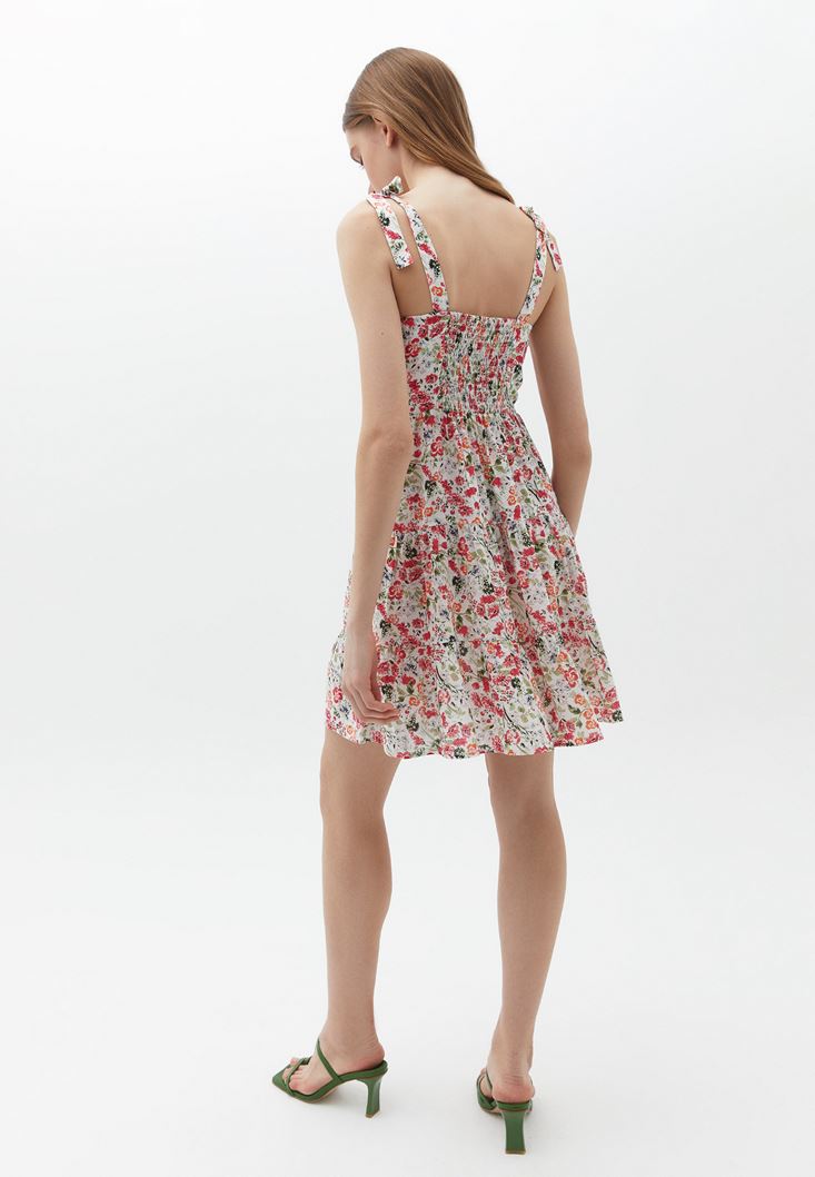 %100 viskon içerikli doku, çiçek desenli, kalın askılı ve askıları bağlama detaylı, kare yaka, mini boy, a line etek kesimi, sırt kısmı gipeli.
