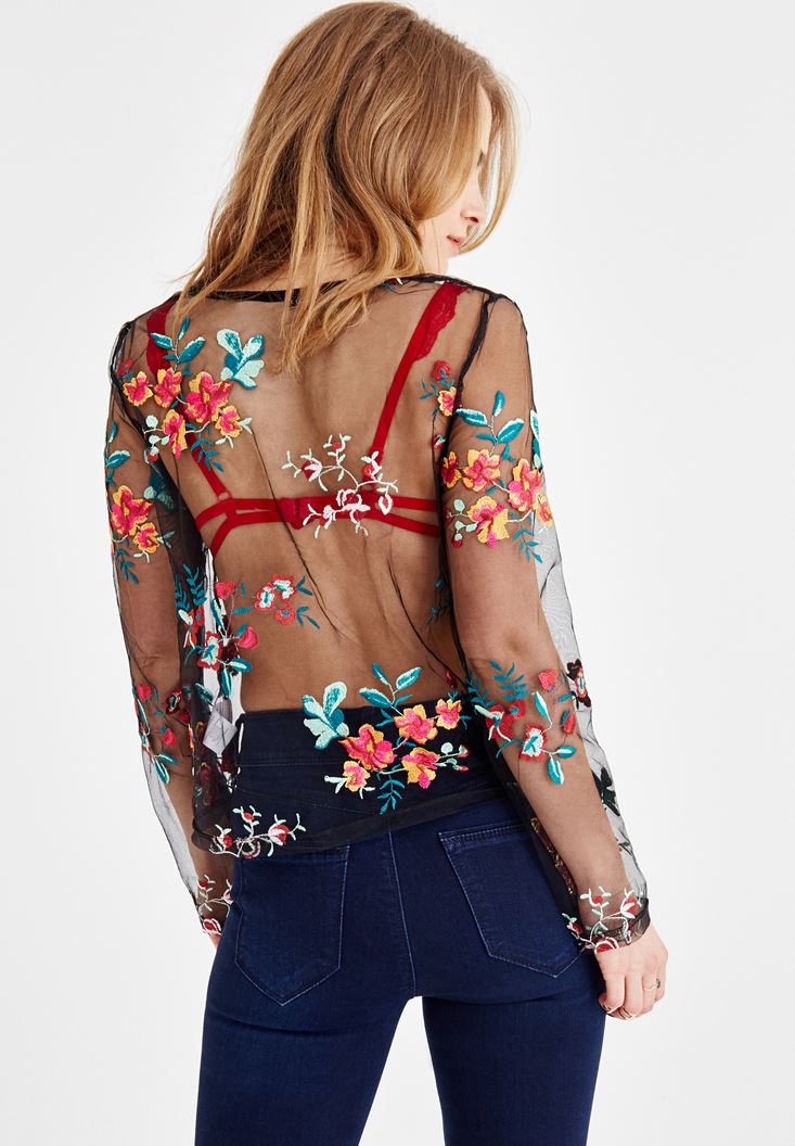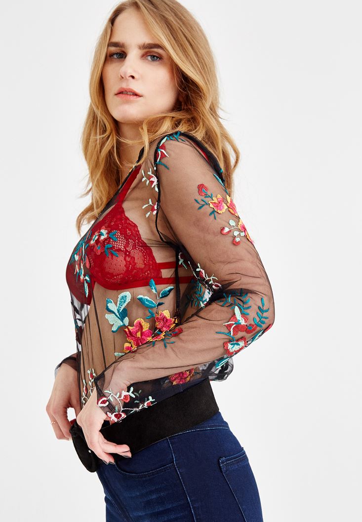 • Bayan Siyah Çiçek Nakışlı Tül Bluz