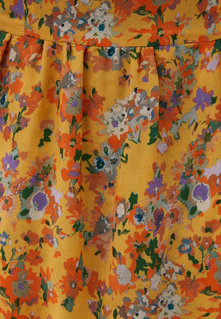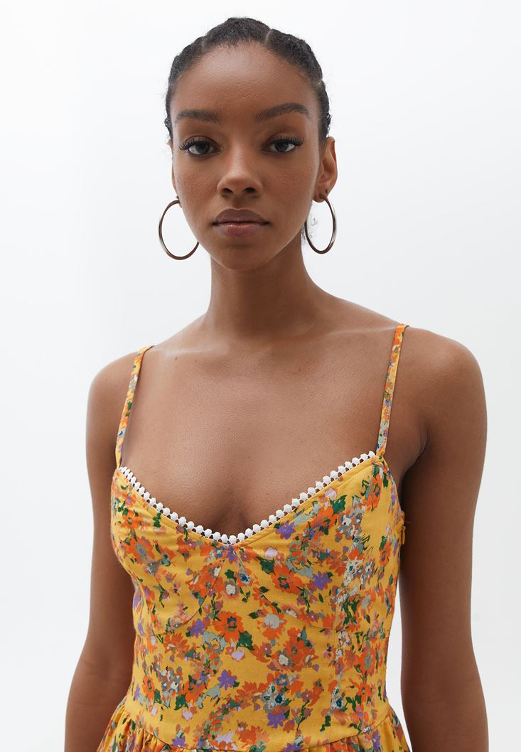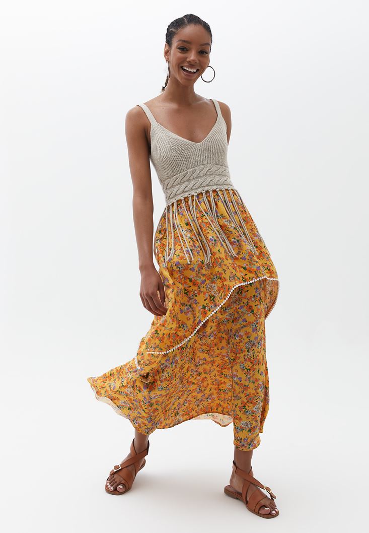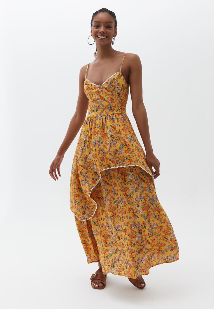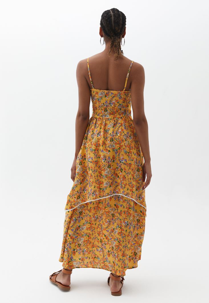 %100 viskon içerikli doku, çiçek desenli, derin V yaka, ayarlanabilir ince askılı, katlı volanlı tasarım, yan kısmı fermuarlı, maxi boy.