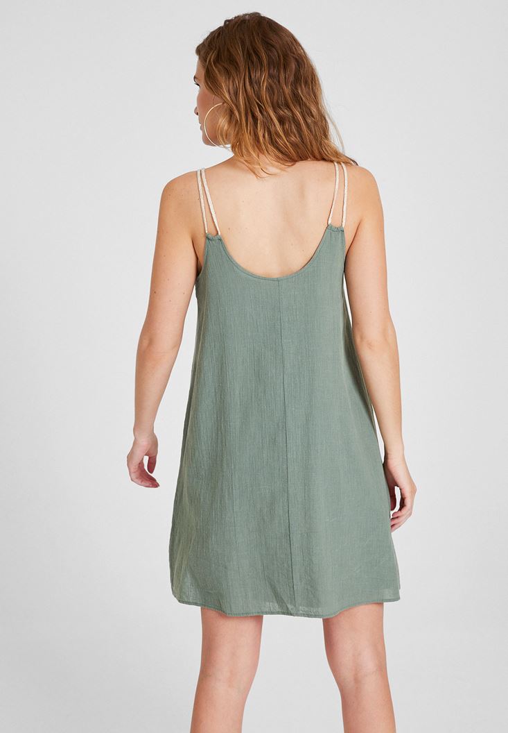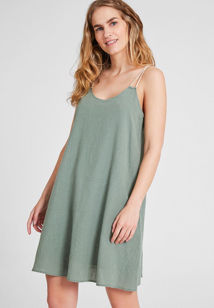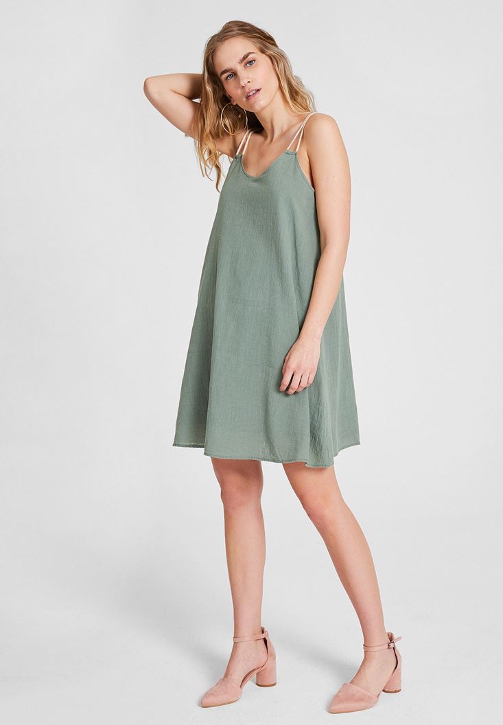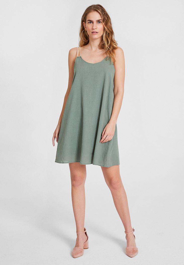 Çift Askili Elbise modeli sade tasarimi, yumusak dokumu ve zarif görüntüsü ile her zaman kullanmaktan keyif alacaginiz parçalardan birisi olacak. Genis yaka kesimi ile zarif bir boyun dekoltesi elde etmenize yardimci olacak elbise modelinin yakasindan çikan kalin aski kesimi ve tek bir kalin aski yerine kullanilan çift aski detayi tasarima hos bir enerji kazandiriyor. Dökümlü kesimi ile konforu ve hareket özgürlügünü bir araya getiren elbise modeli mevsimin enerjisine basarili bir sekilde uyum saglayacak. Pamuk ve keten karisimi dokusu ile hem serin tutan hem de nem emicilik ile rahat hissetmenizi saglayan elbise modeli, OXXO'nun sadeligi ve sikligi bir araya getirdigi elbise modelleri arasinda yer aliyor.