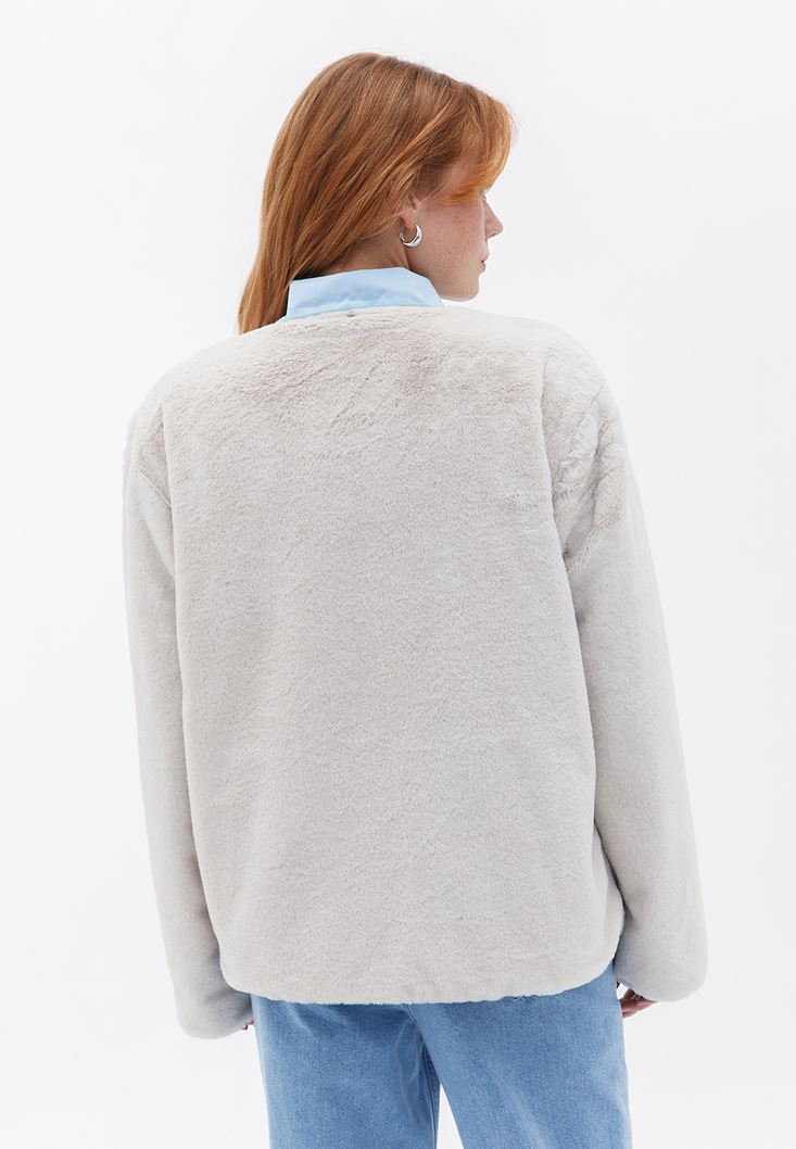 Çift taraflı kullanılabilen kapitone ve peluş doku, bedenden uzak loose fit, çıtçıt kapamalı, kapitone tarafı iki cepli, sıfır yaka.