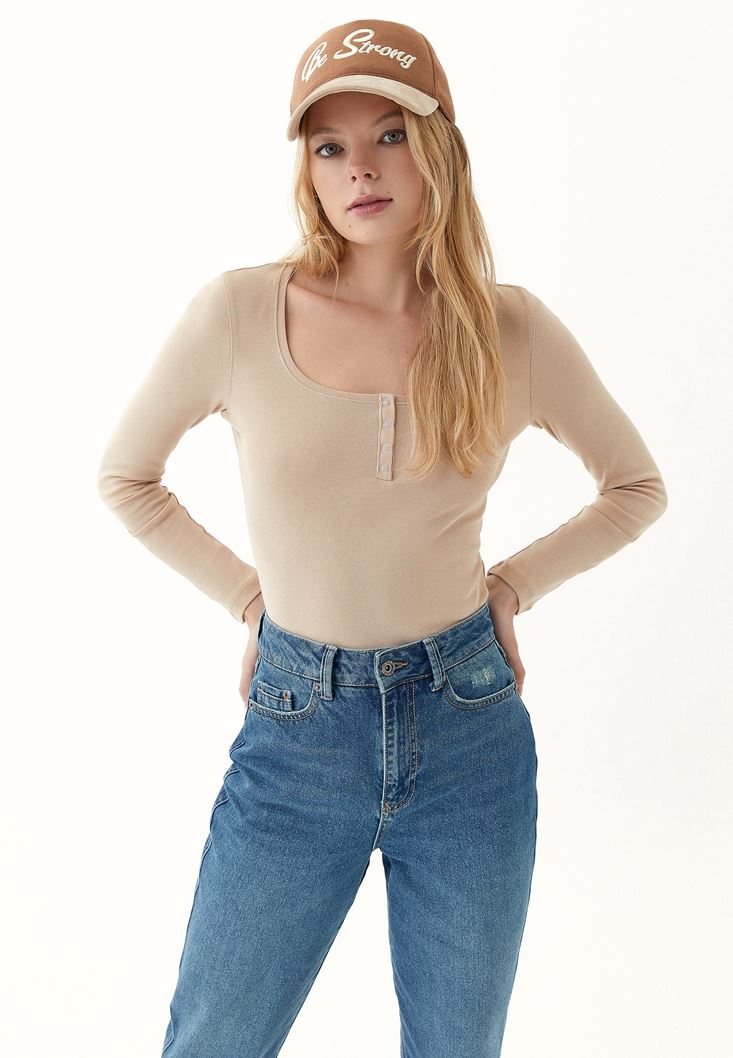 • Bayan Bej Çıtçıtlı Kare Yaka Tişört