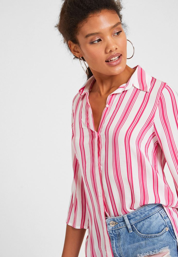 • Bayan Çok Renkli Çizgi Desenli Uzun Kollu Gömlek
