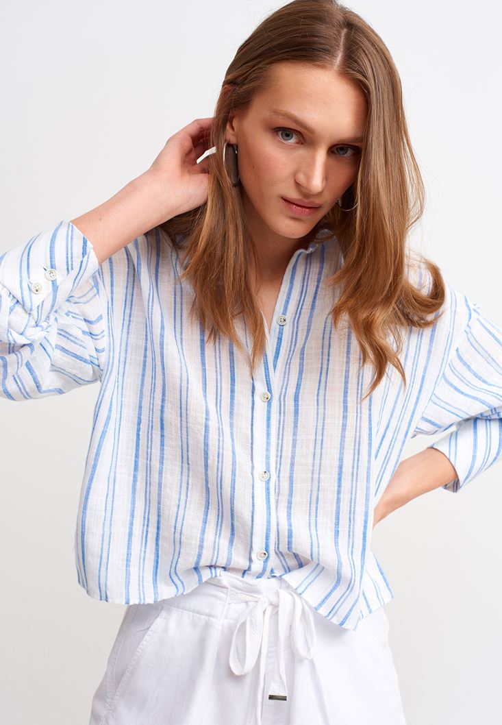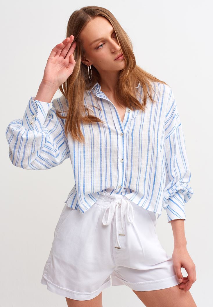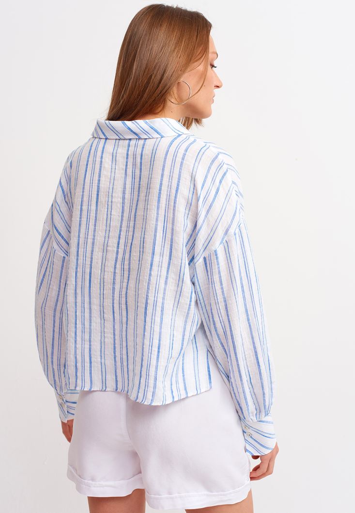 • Bayan Mavi Çizgili Crop Gömlek
