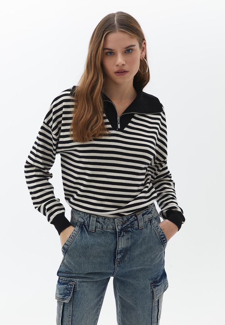 Pamuk karışımlı triko, çizgi desenli, yüksek yaka, bedene yakın rahat fit, uzun kollu, yakası fermuarlı, yaka/kol ve etek ucu jakarlı örgü.