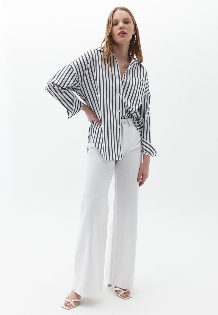 Pamuk karışımlı özel doku, çizgi desenli, bedenden uzak oversize fit, uzun kollu, tek cepli, önü kısa arkası uzun asimetrik kesim.