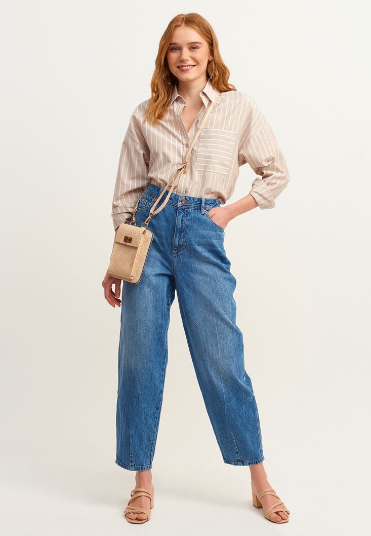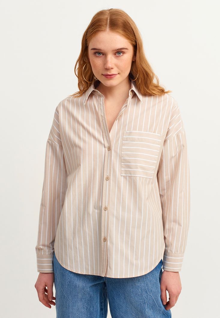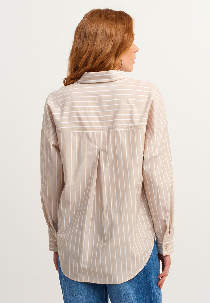 • Bayan Bej Çizgili Oversize Poplin Gömlek