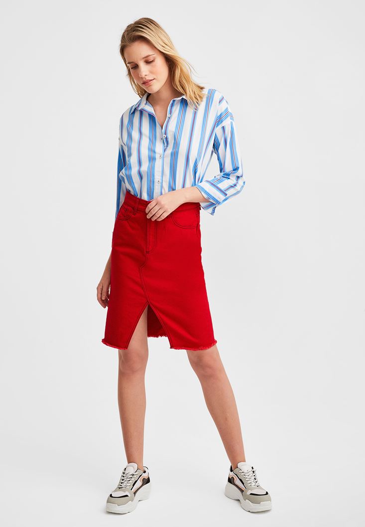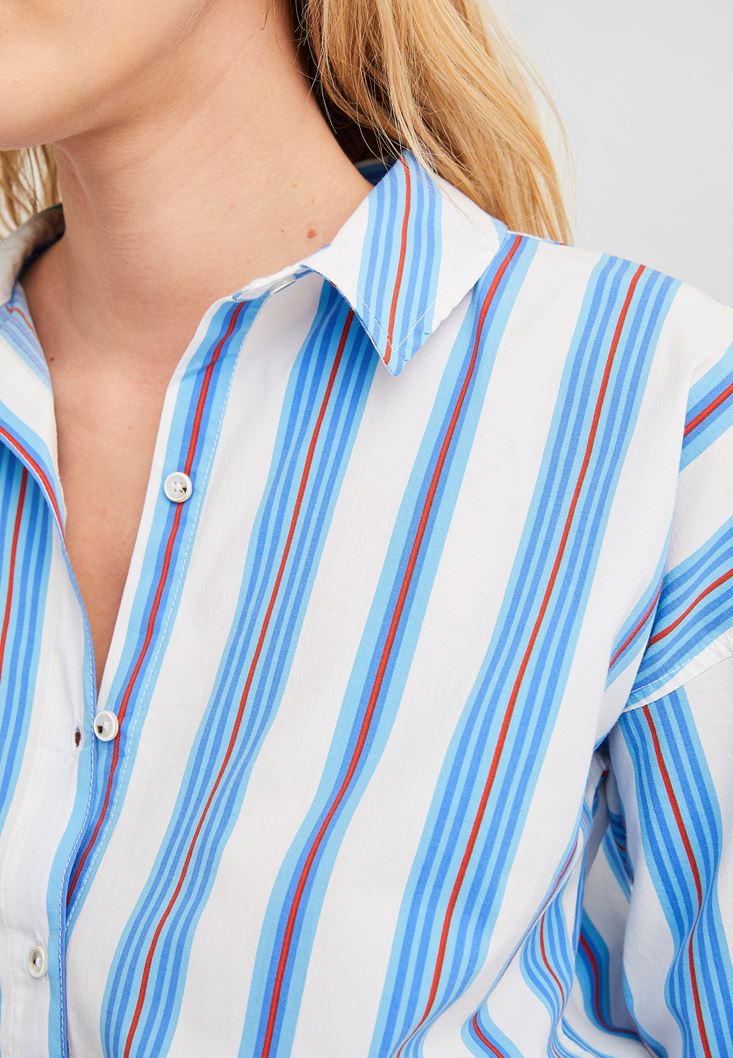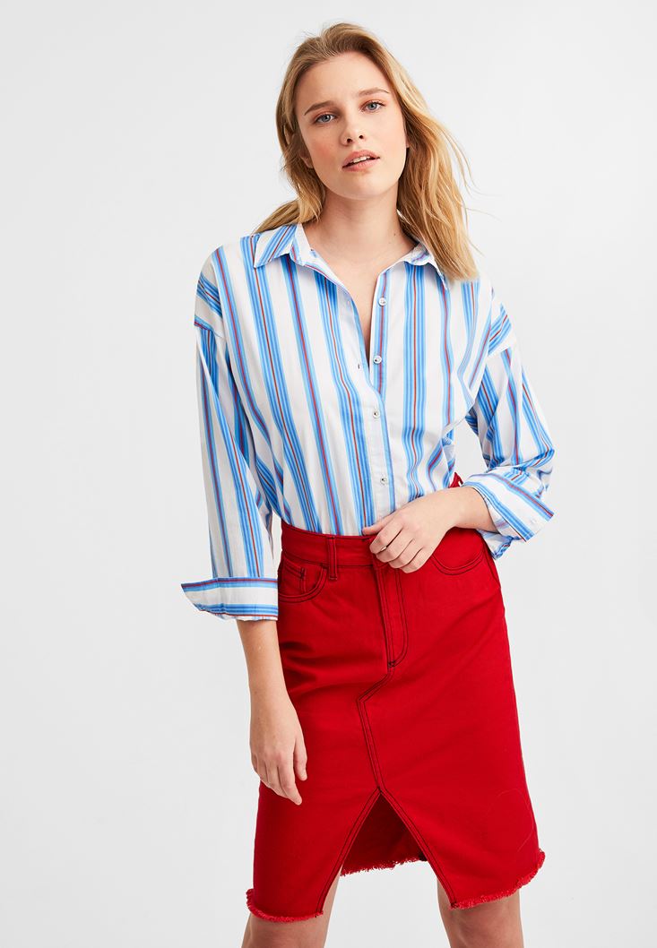 Çok Renkli Çizgili Pamuk Gömlek modeli pamuk içeriğinden dolayı yumuşak bir dokuya sahip olup, terin buharlaşarak havaya karışmasını sağlar ve gün boyu konforlu hissetmenize yardımcı olur. Parlak ve canlı görünüme sahip olan pamuk gömlek çok severek kombinleyebileceğiniz kadın gömlek modellerinden birisi. Modern çizgi deseni ile spor bir şıklık yakalayan çizgili gömlek modeli kombinlerinizde her zaman yer vermekten keyif alacağınız kadın gömlek modelleri arasında.