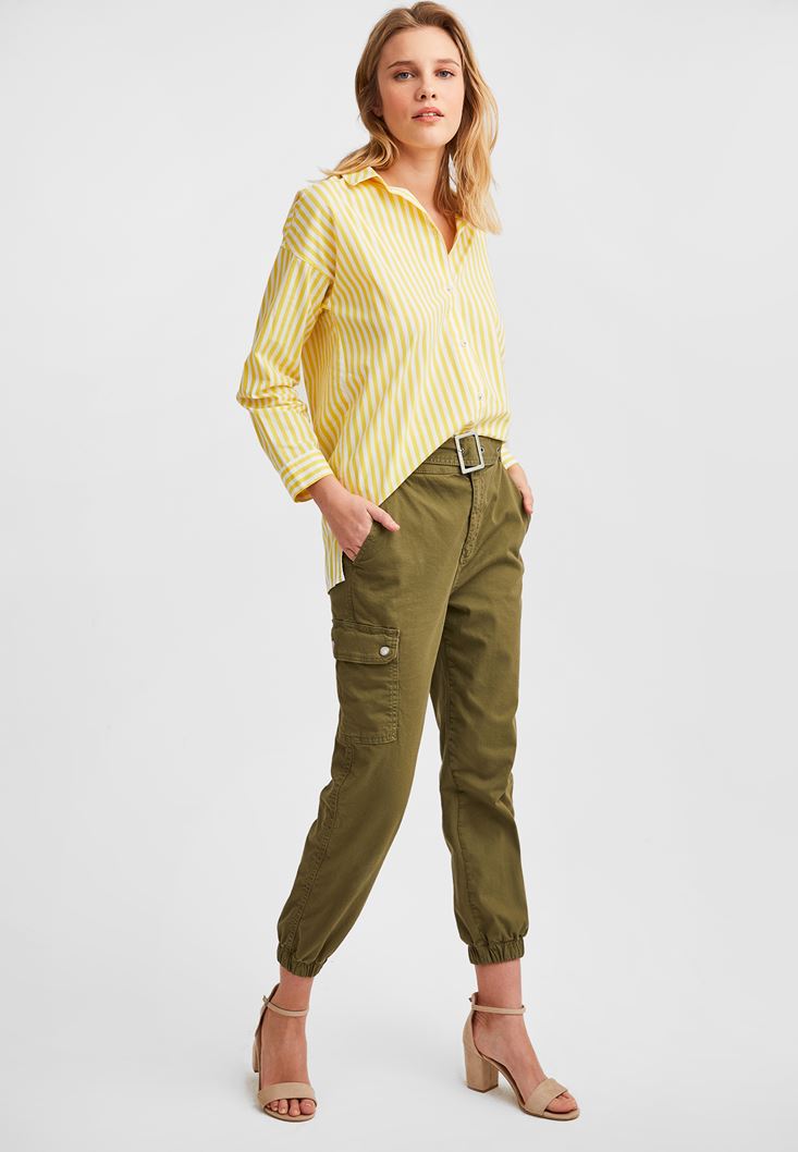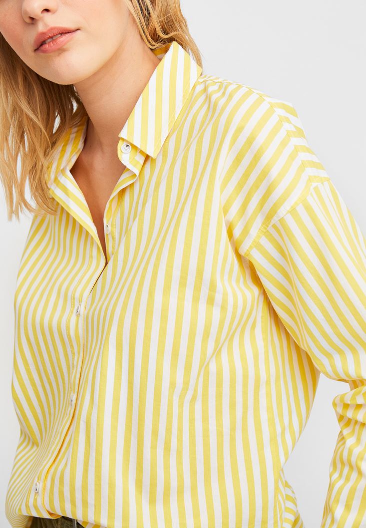 Çok Renkli Çizgili Pamuk Gömlek modeli pamuk içeriğinden dolayı yumuşak bir dokuya sahip olup, terin buharlaşarak havaya karışmasını sağlar ve gün boyu konforlu hissetmenize yardımcı olur. Parlak ve canlı görünüme sahip olan pamuk gömlek çok severek kombinleyebileceğiniz kadın gömlek modellerinden birisi. Modern çizgi deseni ile spor bir şıklık yakalayan çizgili gömlek modeli kombinlerinizde her zaman yer vermekten keyif alacağınız kadın gömlek modelleri arasında.