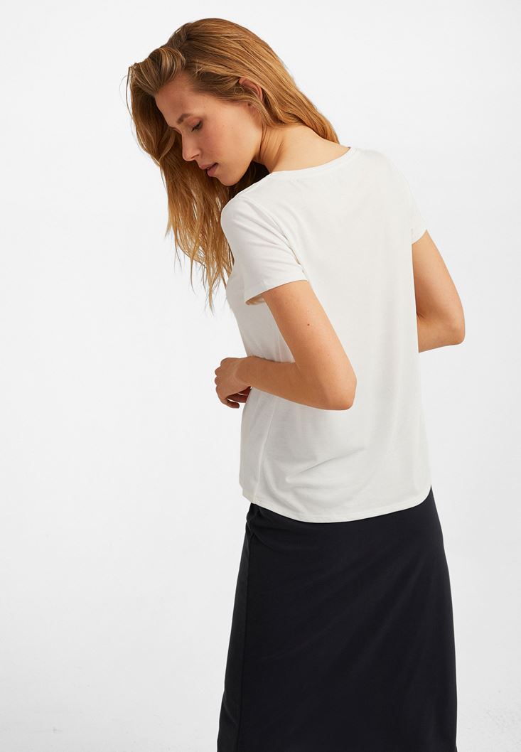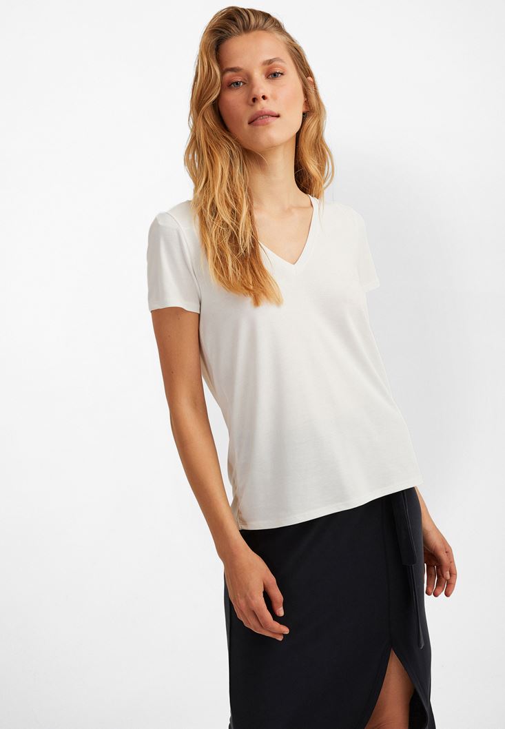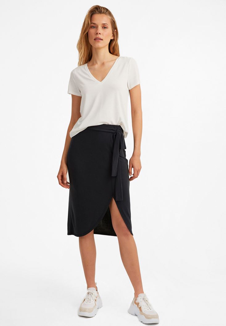 V Yaka Tişört ve Kemerli Midi Etek Kombini