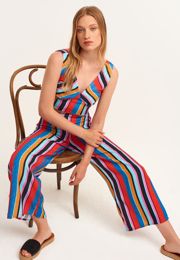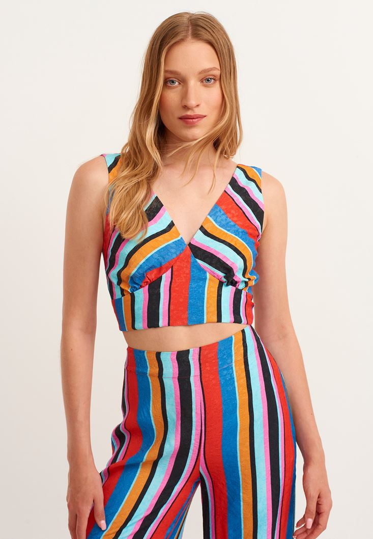 Çok Renkli Çizgili V-Neck Crop Atlet