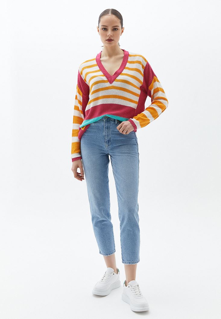 • Bayan Çok Renkli Çizgili V Yaka Triko Kazak