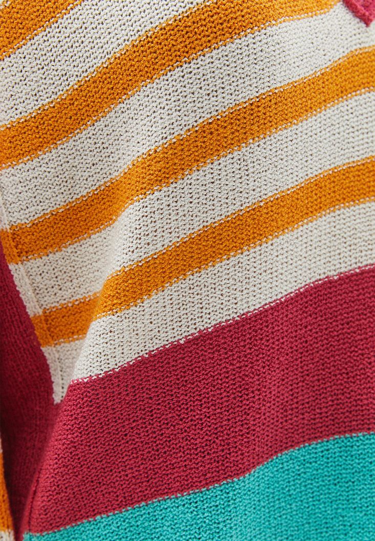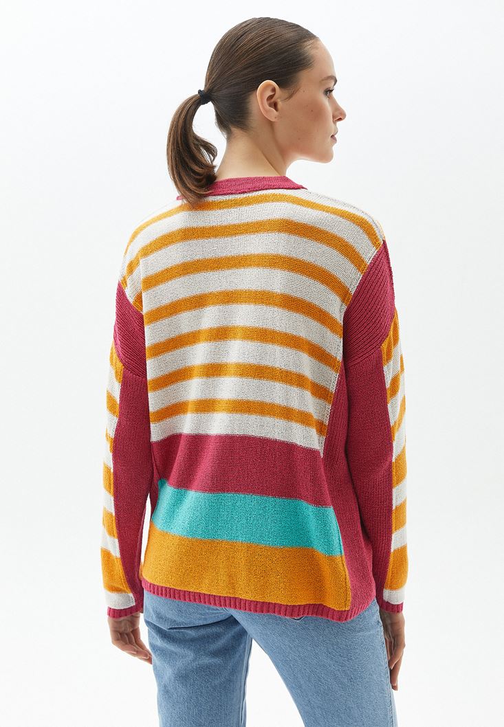 Özel triko doku, renkli ve çizgili desenli, V yaka, bedenden uzak rahat fit, uzun kollu.