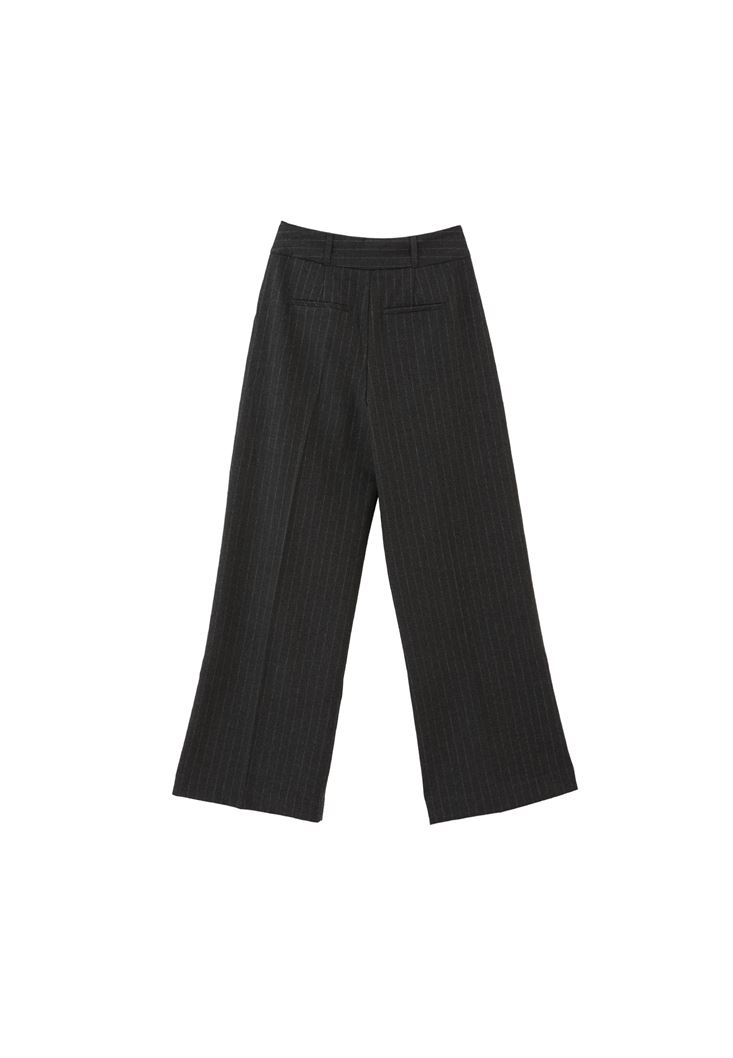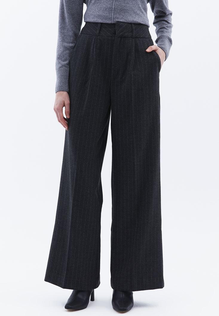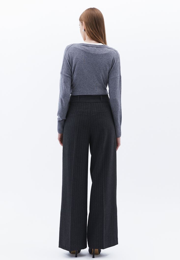Viskon içerikli doku, ultra yüksek bel, bedenden uzak rahat fit, bol paça, iki cepli, ön bel kısmı pile detaylı, çizgi desenli.
