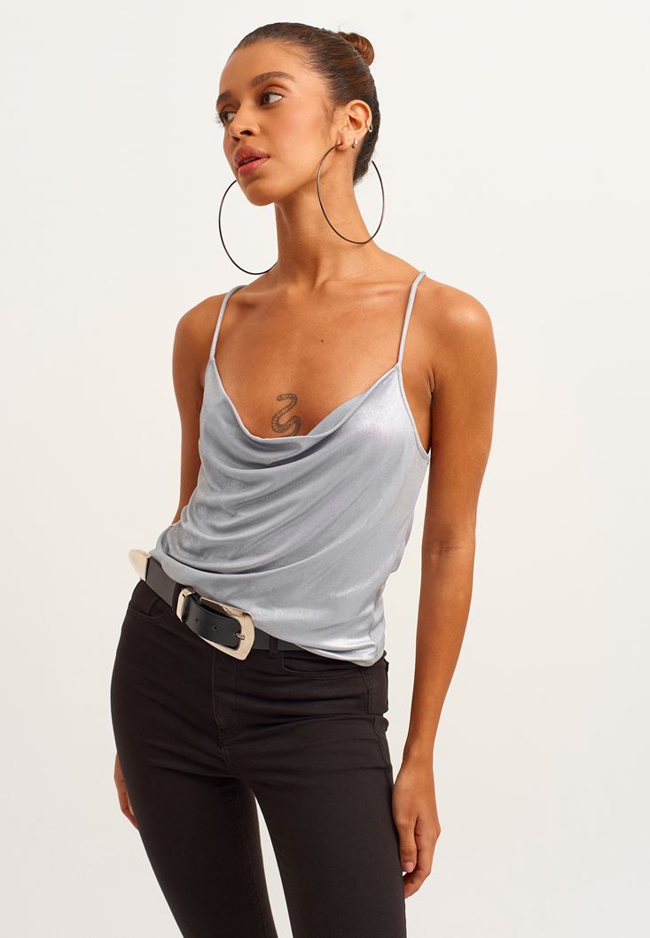 • Bayan Gri Cowl-Neck Sırt Detaylı Crop Tank