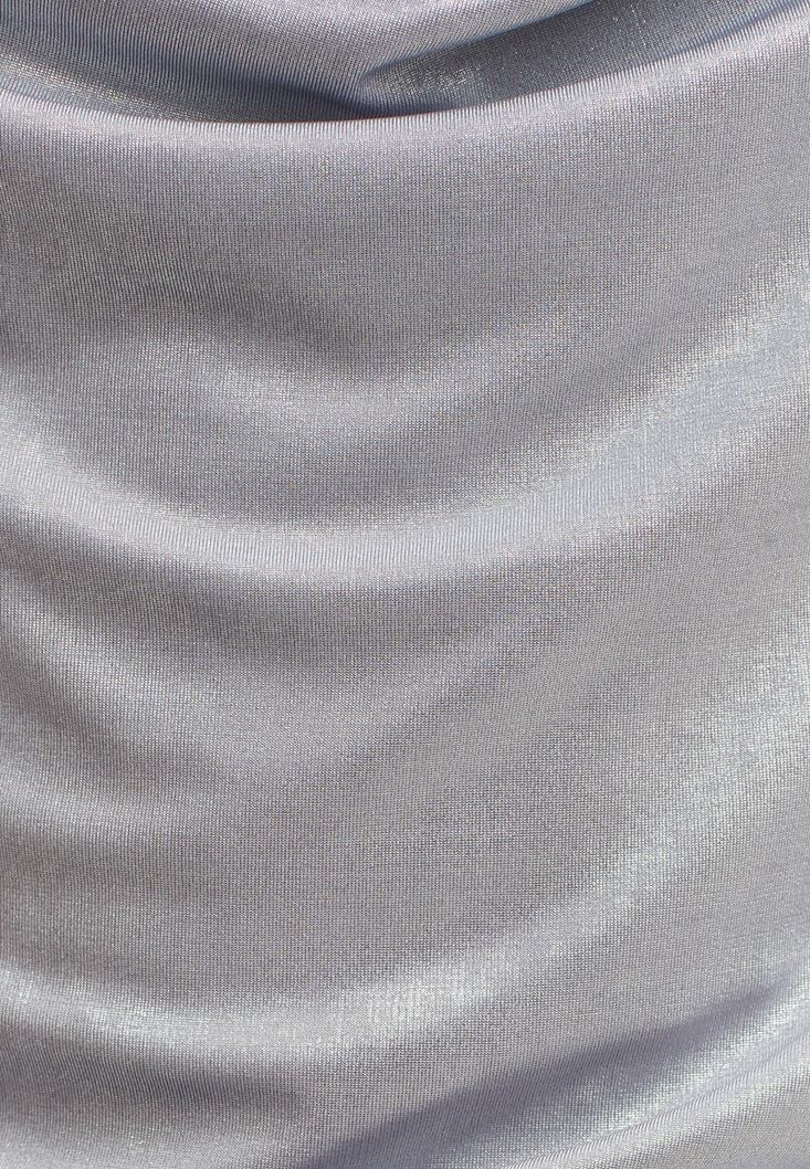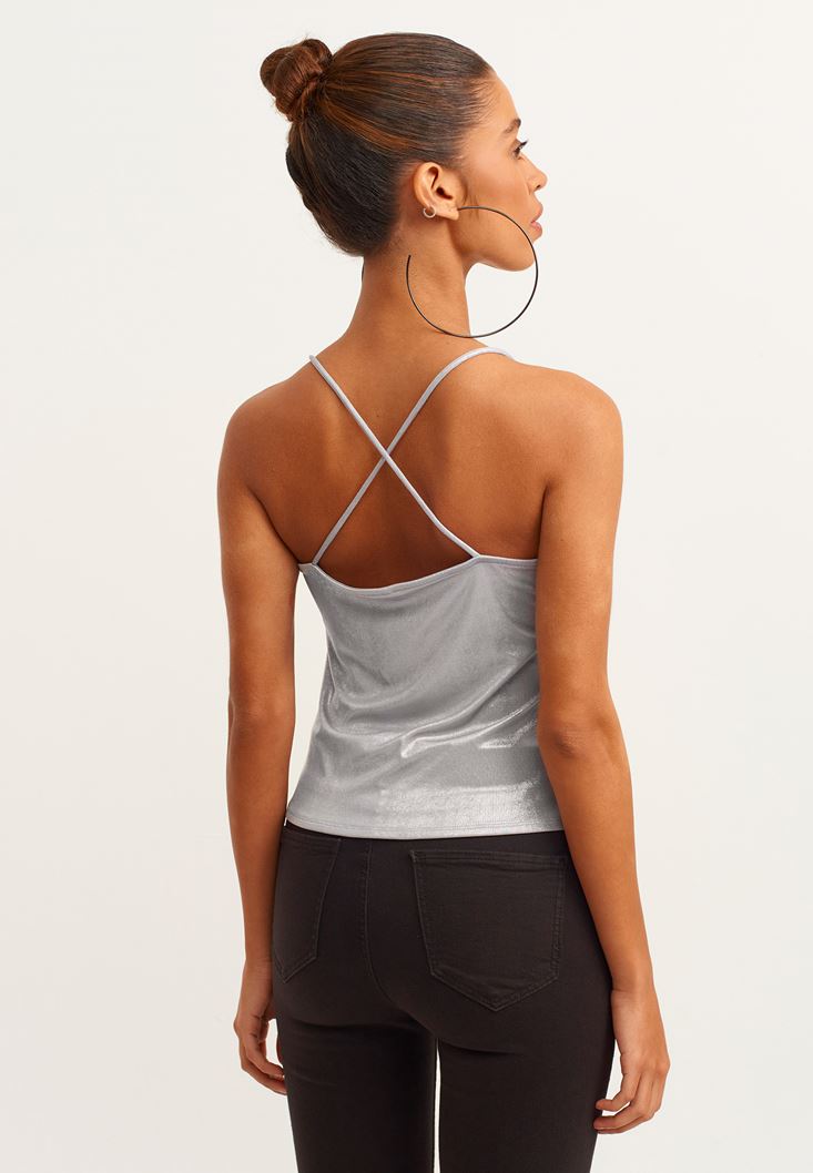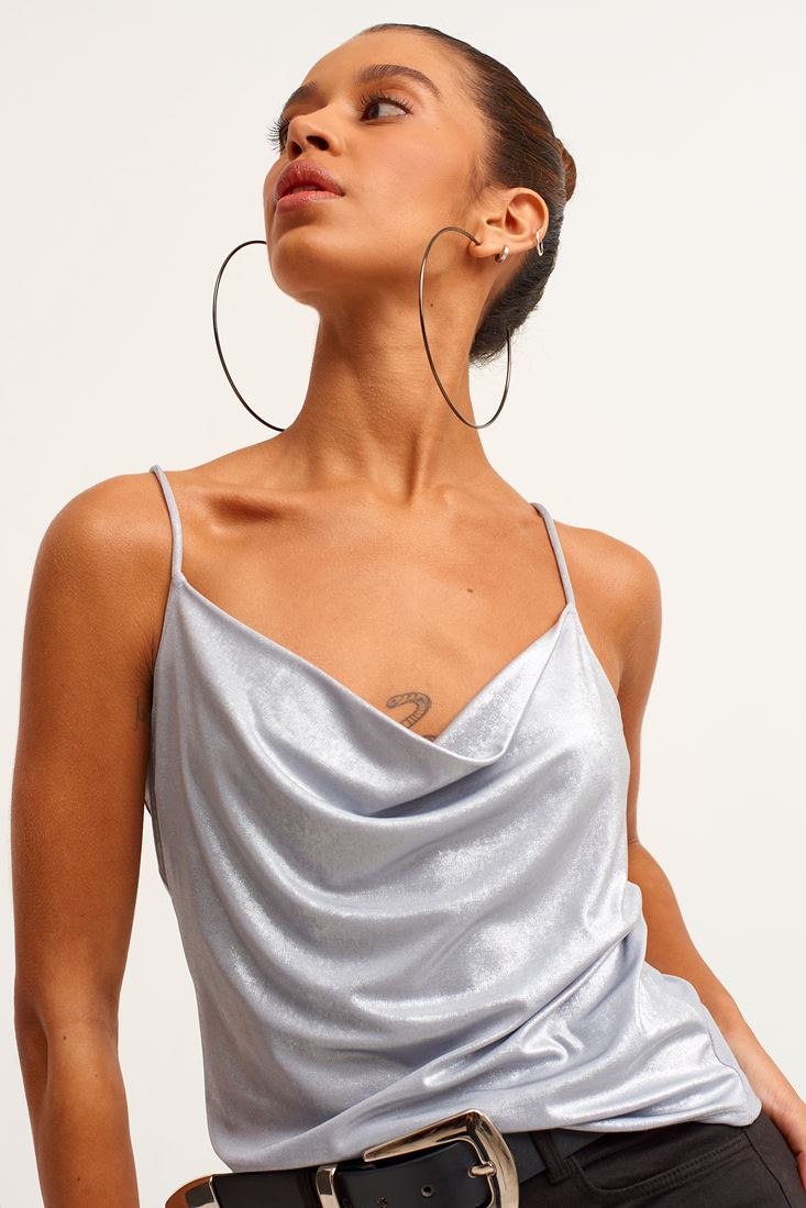 Parlak görünümlü özel doku, ince askılı, degaje yaka, sırtı çapraz askılı, bedene yakın close-fit.