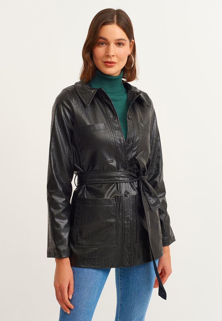Crocodile desenli vegan deri doku, midi boy, bedene yakın rahat form, kendi kumaşından kuşaklı, düğme kapamalı, üst ve alt kısmı iki cepli.