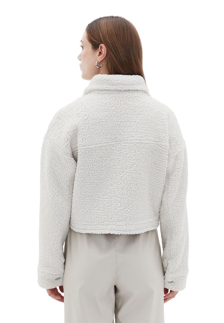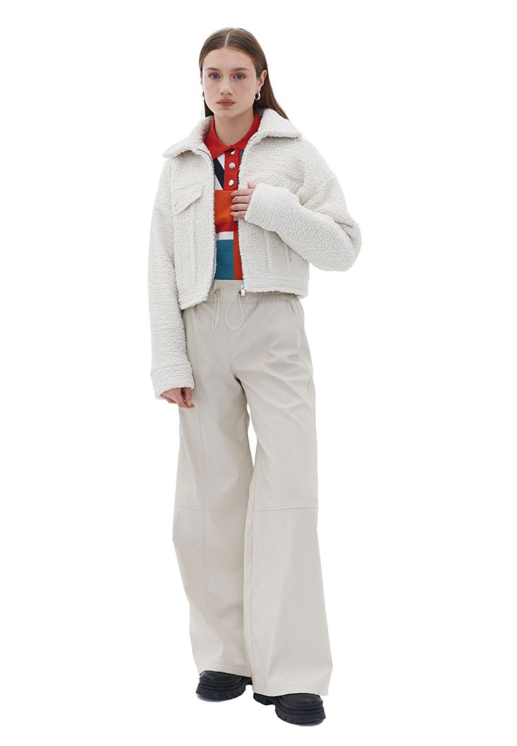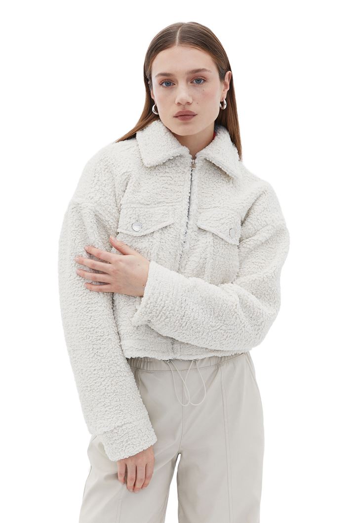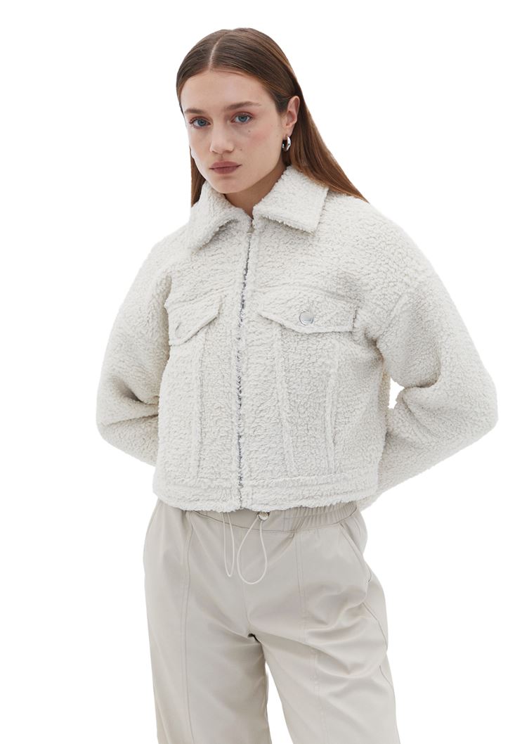 Yumuşak buklet doku, crop kesim, bedene yakın fit, içi astarlı, fermuar kapamalı, iki cepli.