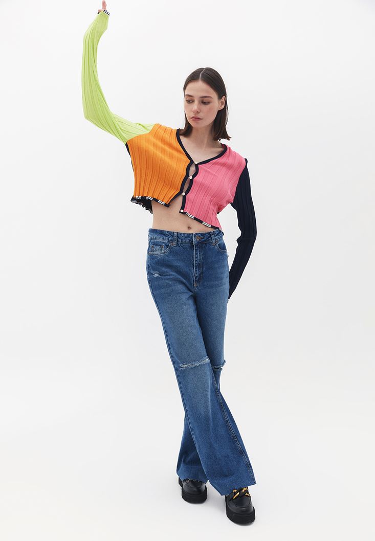 Viskon karışımlı triko, fitilli ve renkli doku, V yaka, uzun kollu, crop kesim, düğme kapamalı, bedeni saran fit.
