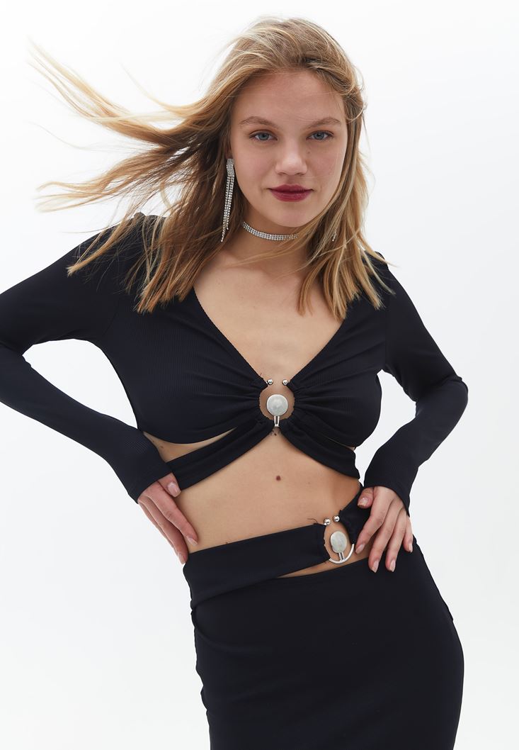Bedeni saran esnek fit, uzun kollu, V yaka, ön kısmı toka detaylı, bel kısmı cut out tasarımlı, crop kesim.