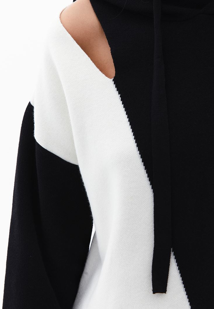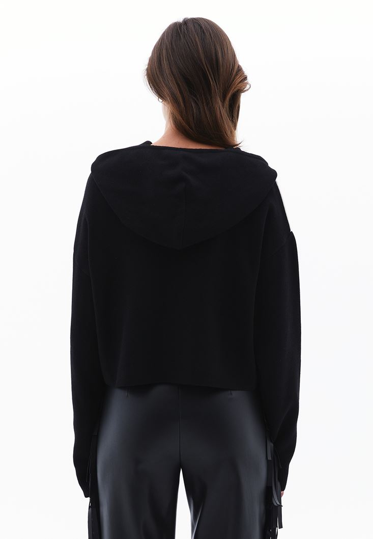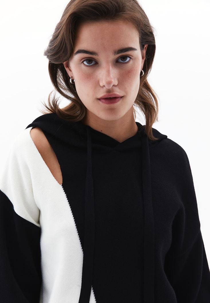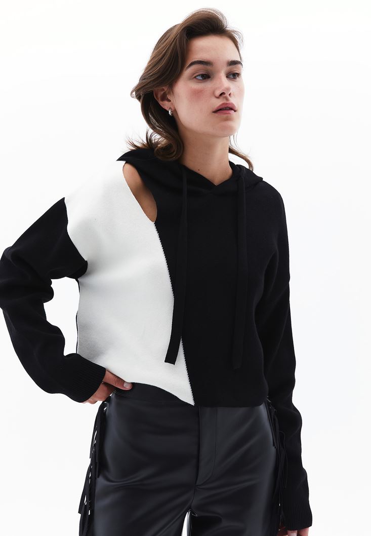 Viskon karışımlı doku, bağcıklı kapüşon, uzun kollu, crop kesim, bedenden uzak loose fit, tek omzu cut out detaylı.