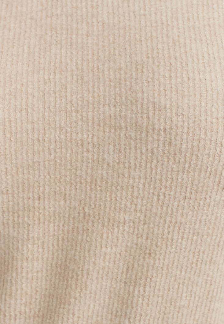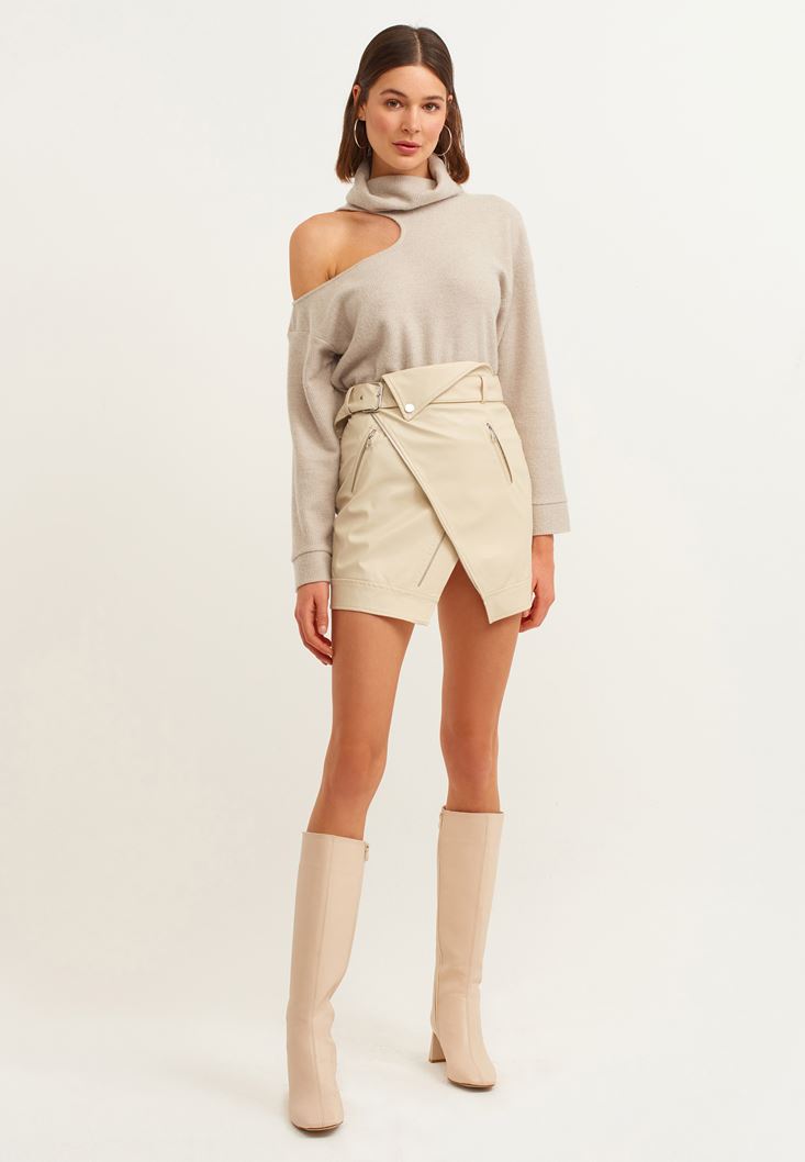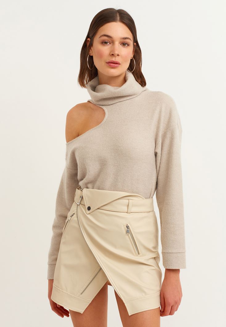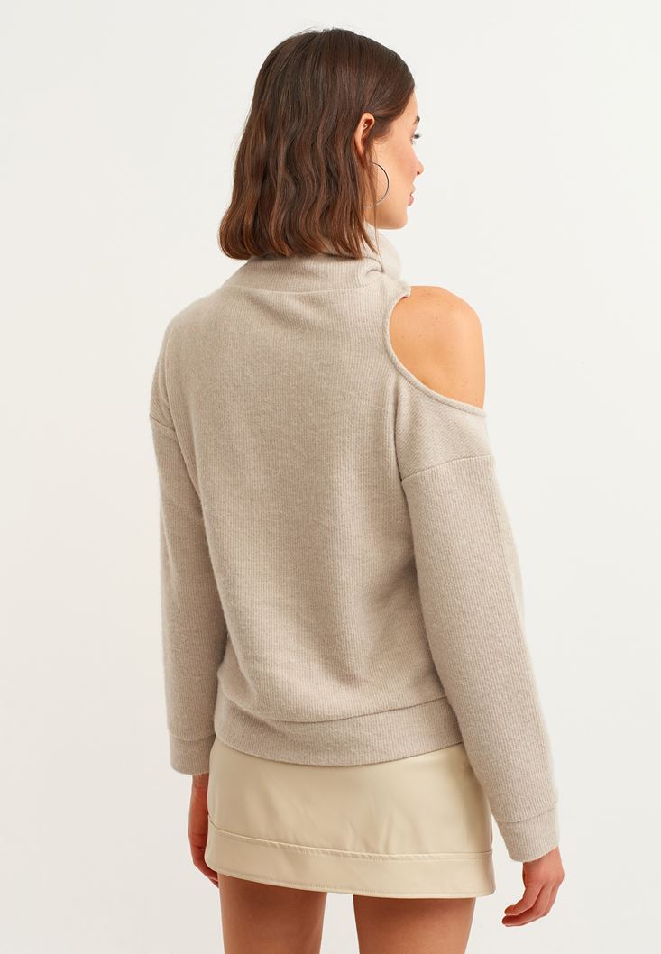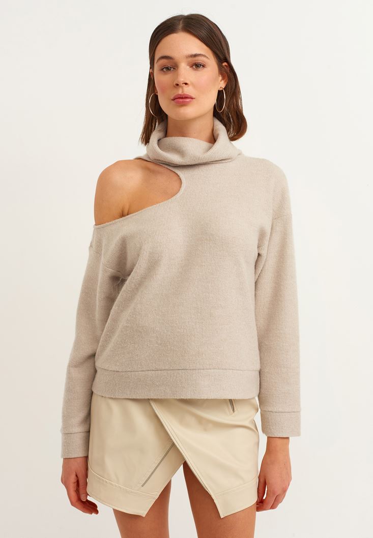 Bej Cut-Out Detaylı Dik Yaka Kazak