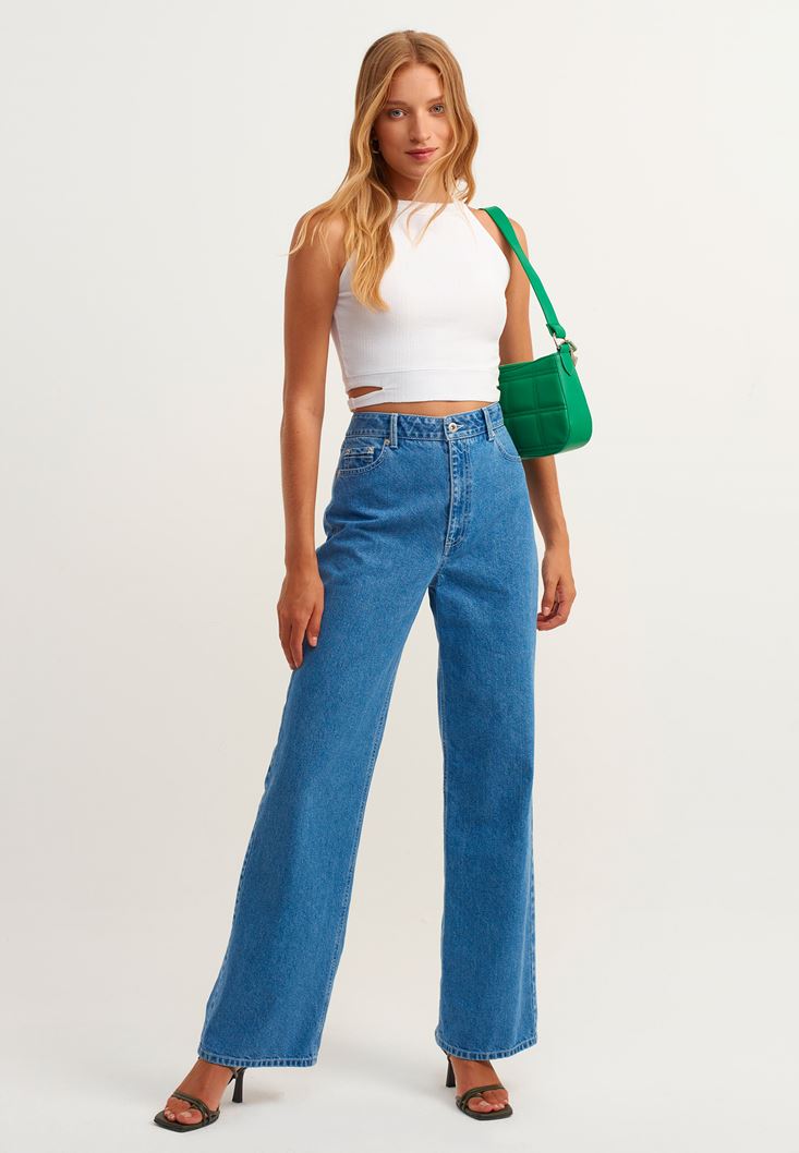 Viskon karışımlı özel doku, bedeni saran rahat kalıp, halter yaka, bel kısmı kesik detaylı, crop kesim.