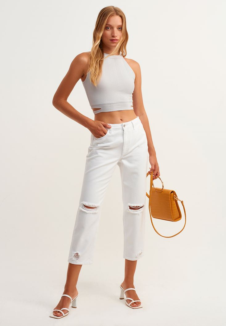 Viskon karışımlı özel doku, bedeni saran rahat kalıp, halter yaka, bel kısmı kesik detaylı, crop kesim.