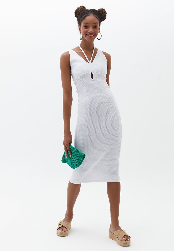 Beyaz Cut-Out Detaylı Midi Boy Elbise