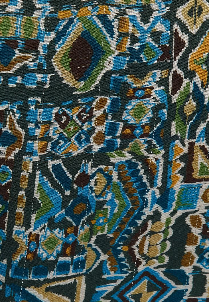 Viskon içerikli doku, mix desenli, yüksek yaka, bedene yakın fit, a kesim etek, uzun kollu, üst kısmı cut out detaylı, beli gipeli.