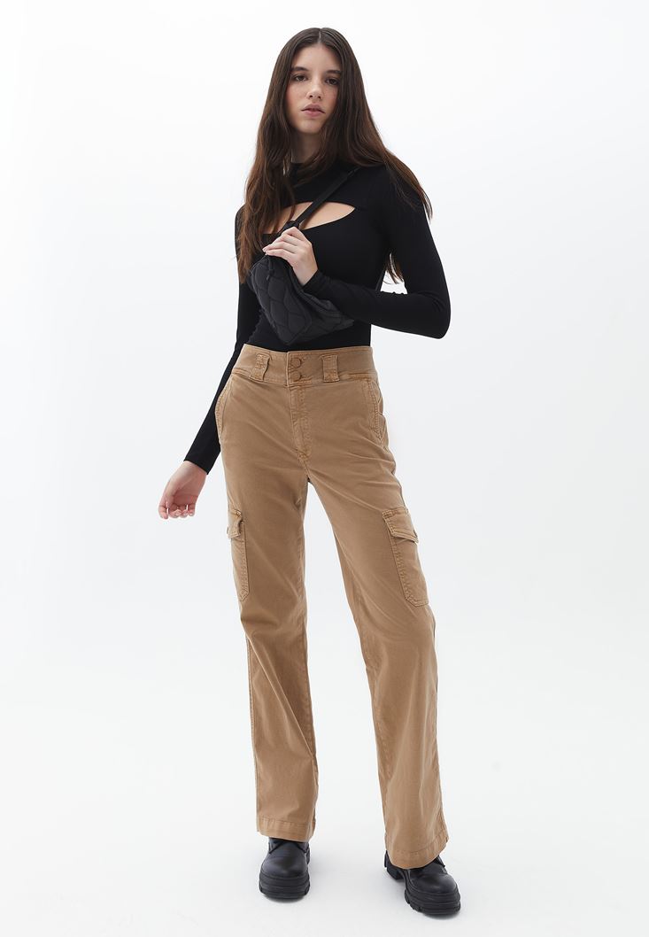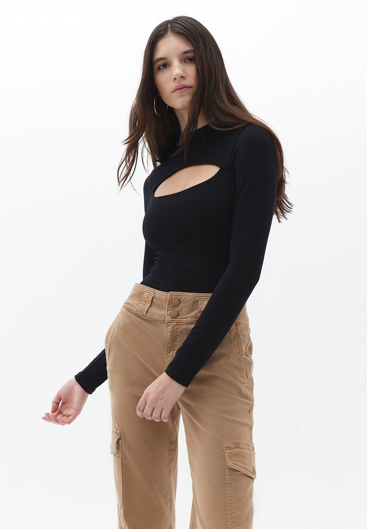 Pamuk karışımlı yumuşak doku, ön kısmı cut out detaylı, uzun kollu, yüksek yaka, bedeni saran esnek fit.