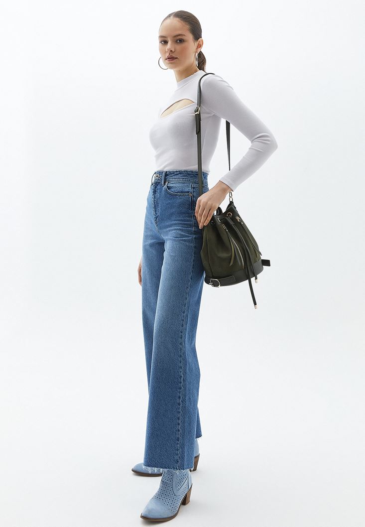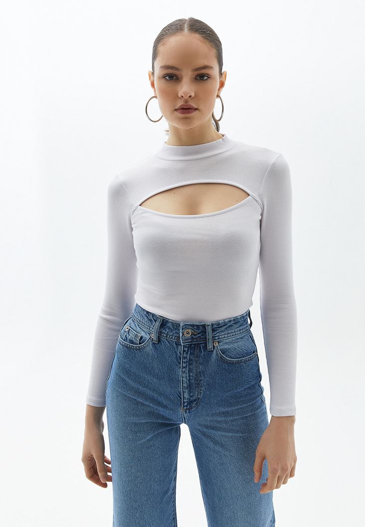 Beyaz Cut-Out Detaylı Uzun Kollu Tişört