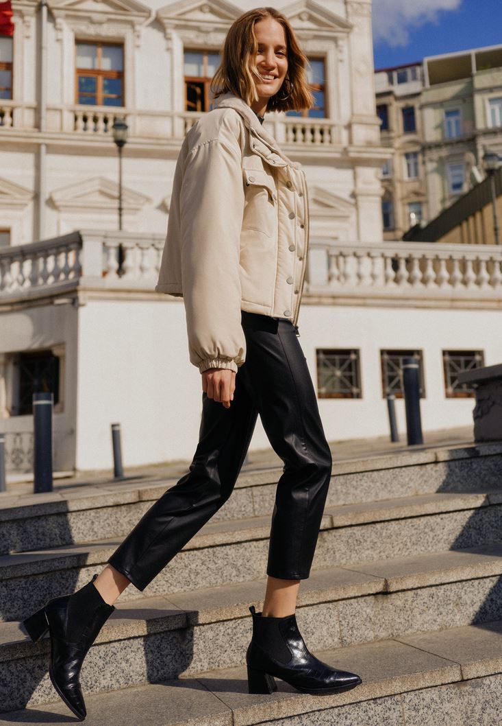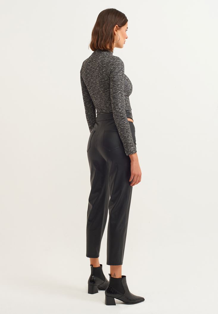 Vegan deri doku, bel kısmı kesik detaylı, yüksek bel, ön kısmı cep görünümlü, arkası iki cepli, bedene yakın cigarette-fit, slim paça, bilekte biten paça boyu.