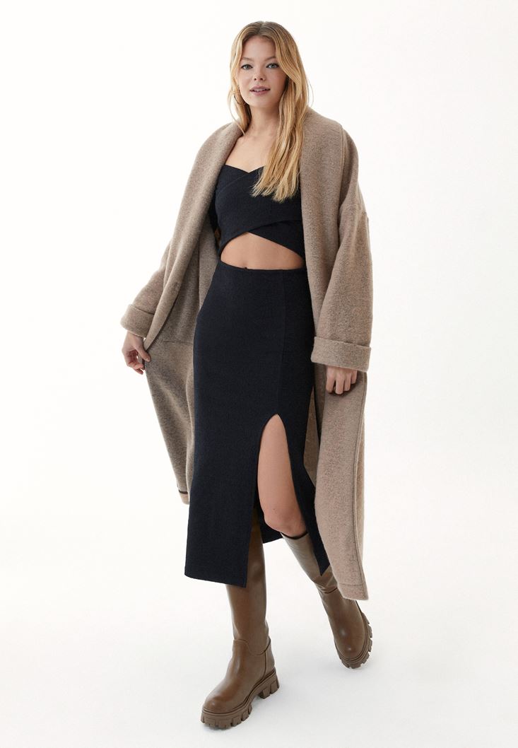 Pamuk karışımlı özel doku, midi boy, beli cut-out detaylı, geniş yaka, uzun kollu, ön kısmı tek yırtmaçlı, sırt kısmı kare kesim, bedeni saran esnek fit, göğüs kısmı kruvaze detaylı.