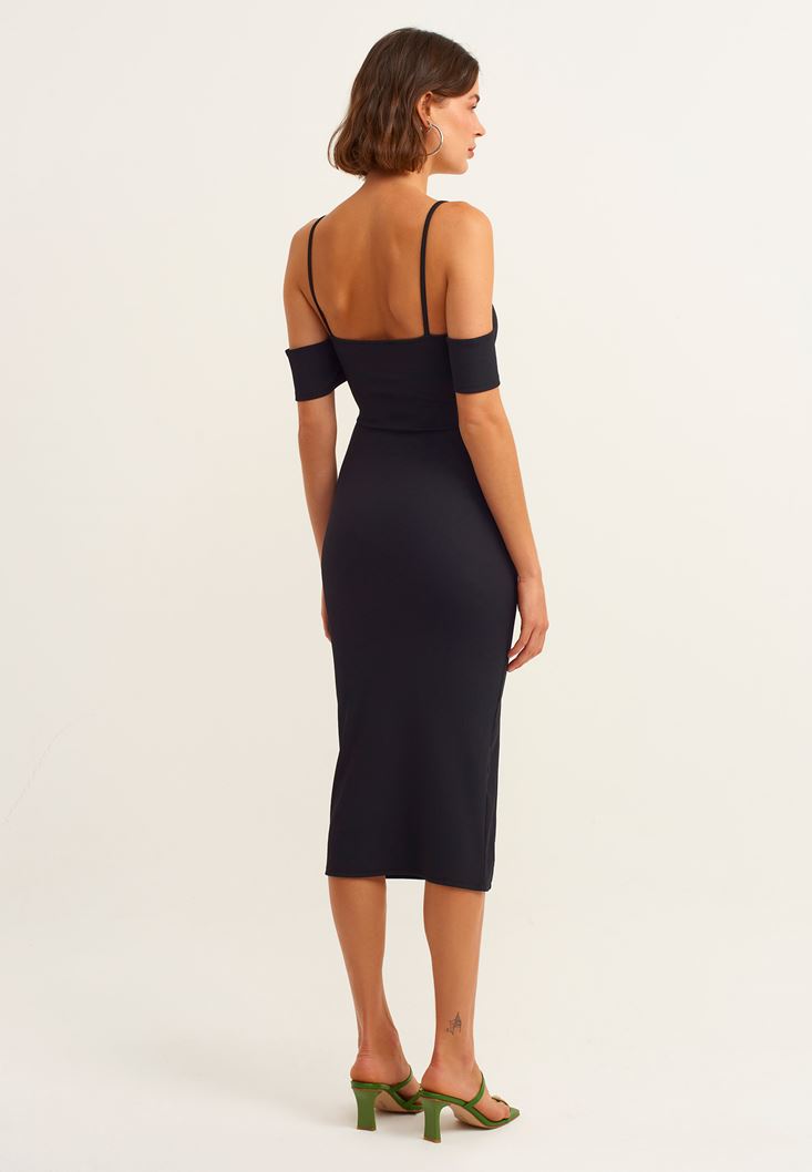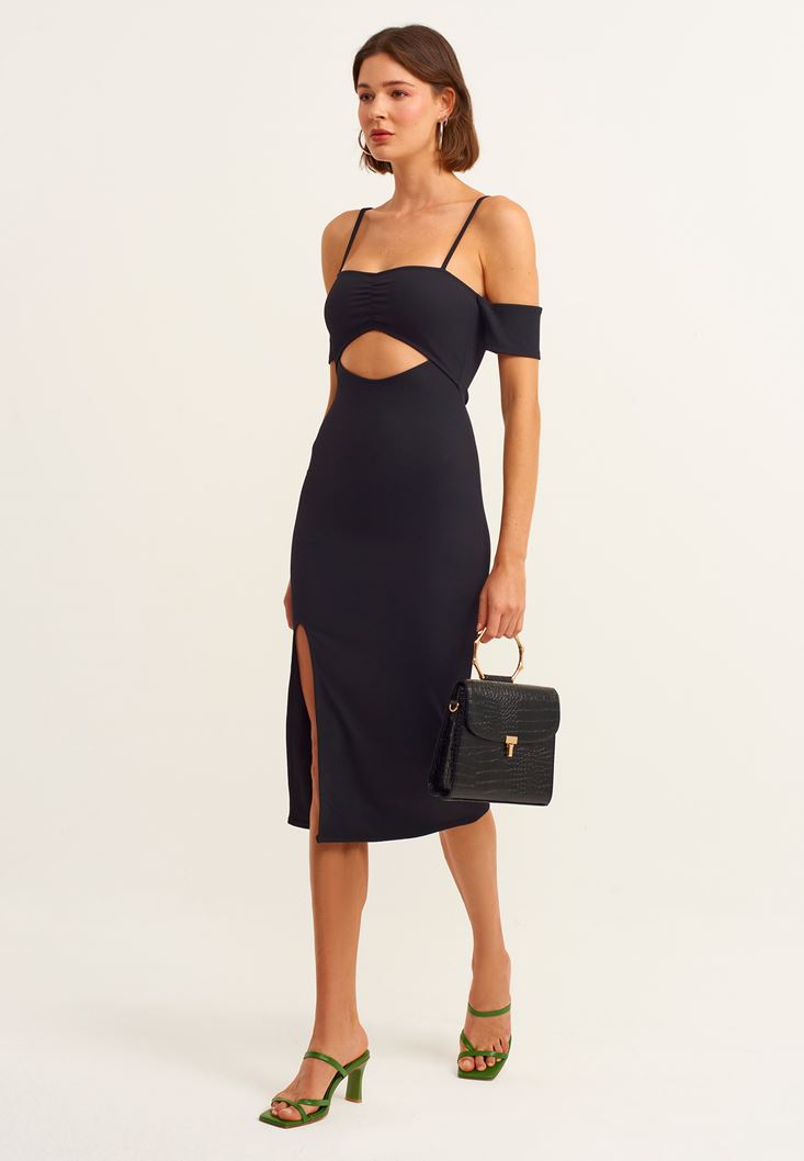 Siyah Cut-Out Detaylı Yırtmaçlı Midi Elbise