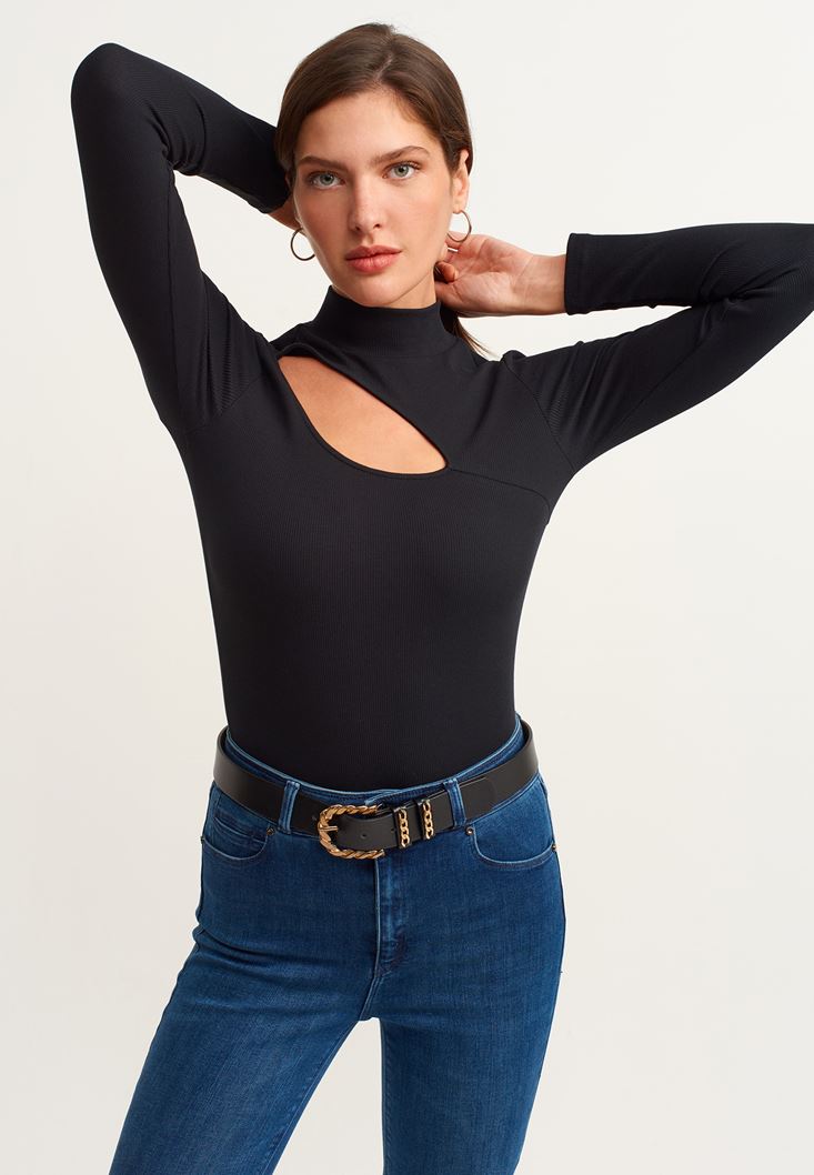 • Bayan Siyah Cut-Out Pamuklu Tişört