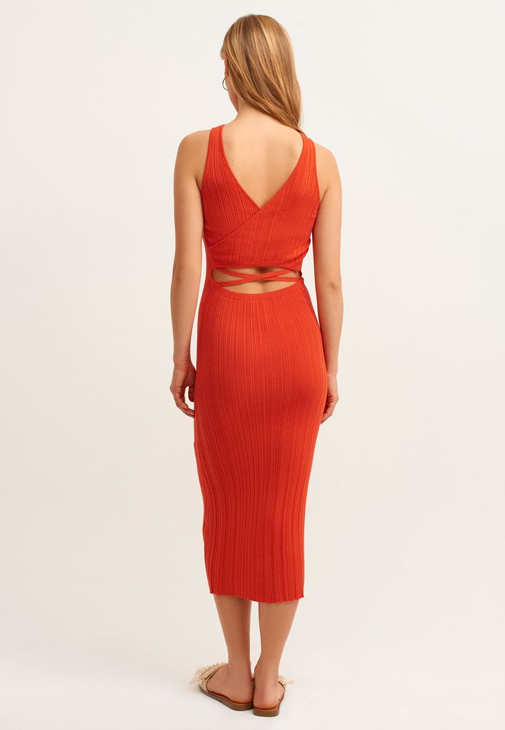 Viskon karışımlı triko doku, bedeni saran esnek kalıp, midi boy, sırtı kruvaze ve cut-out detaylı.
