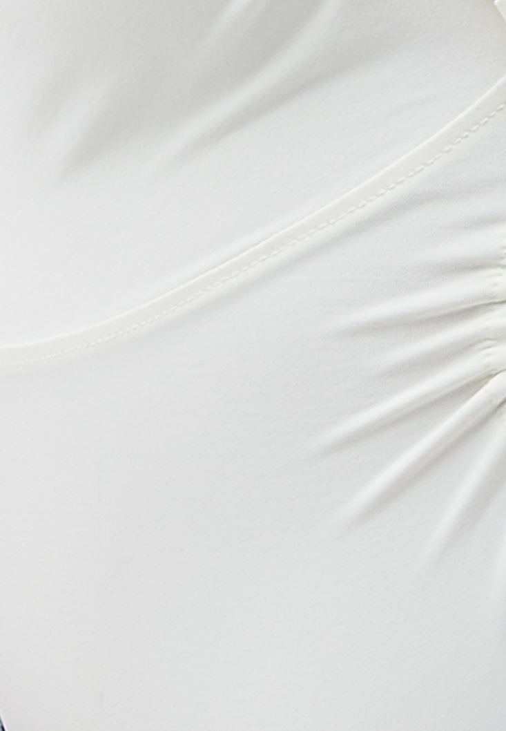 Bedeni saran esnek doku, büzgülü ve cut-out detaylı yaka, sırt kısmı çapraz askı geçişli, çıtçıt kapamalı.