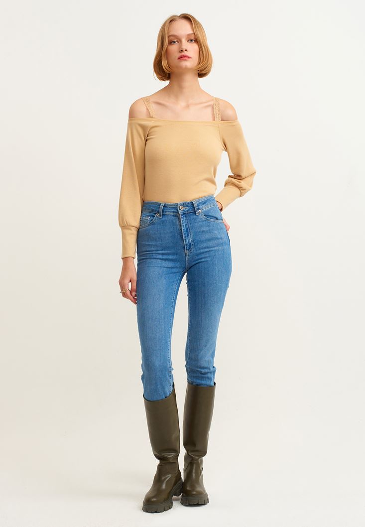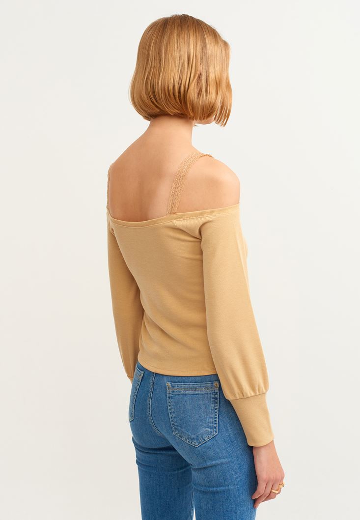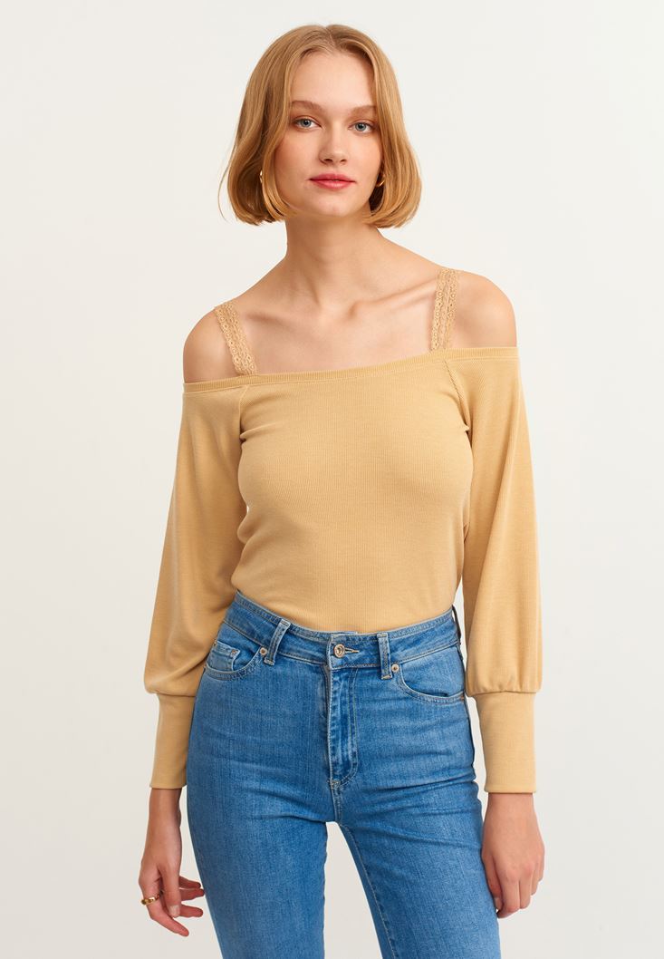 Viskon karışımlı özel doku, dantelli askı detayı, düşük omuz, uzun kollu, balon kollu, standart boy, bedene yakın rahat fit.