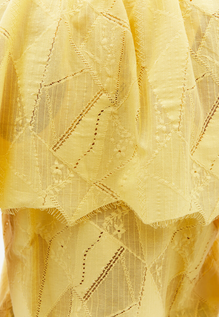 Pamuk karışımlı dantelli doku, bedenden uzak loose fit, içi atlet detaylı, bot yaka, iki parçalı katlı tasarım.