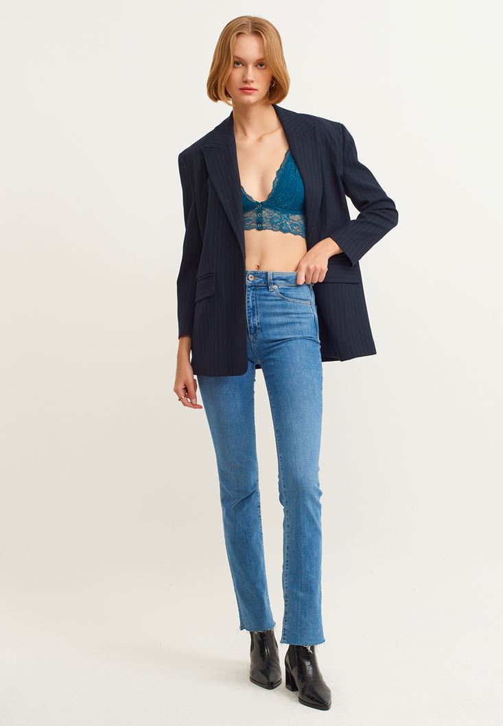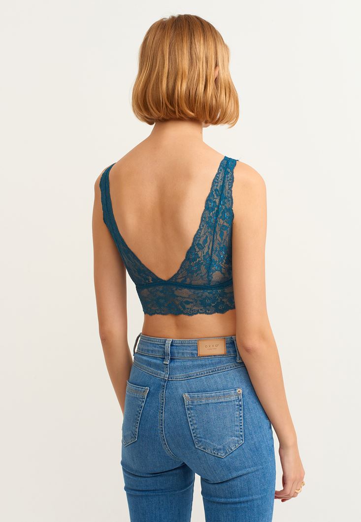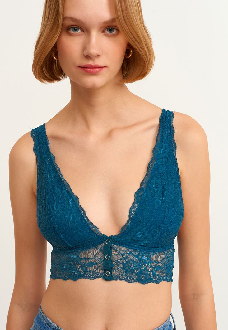 Dantelli doku, bedeni saran fit, ince sünger dolgulu, ön kısmı çıtçıt kapamalı, kalın askılı, sırt kısmı V kesim.