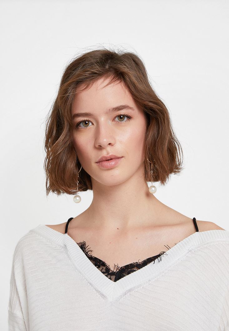 • Bayan Krem Dantel Detaylı Düşük Omuzlu Triko